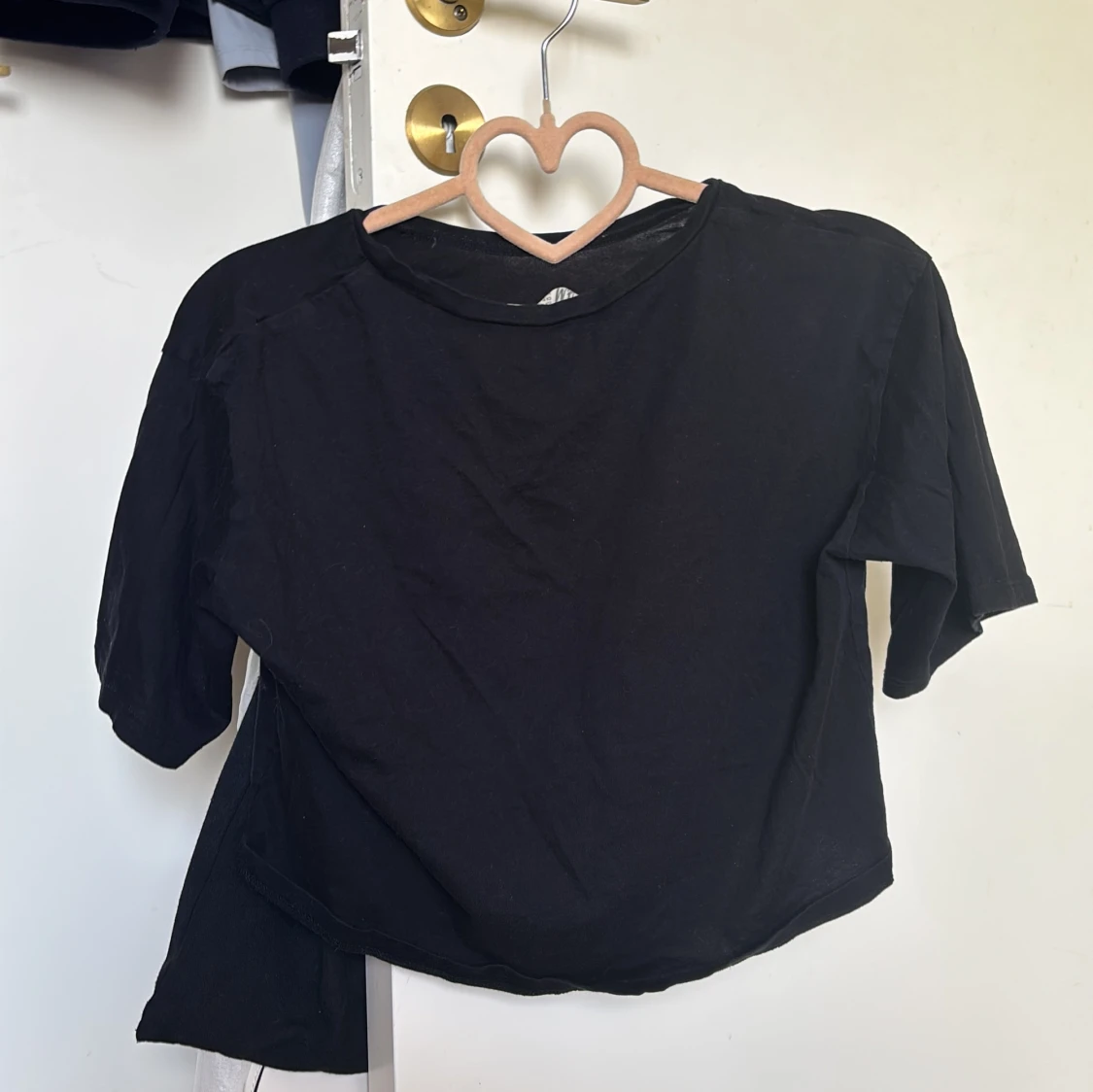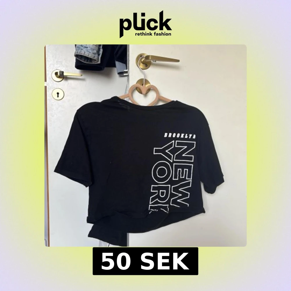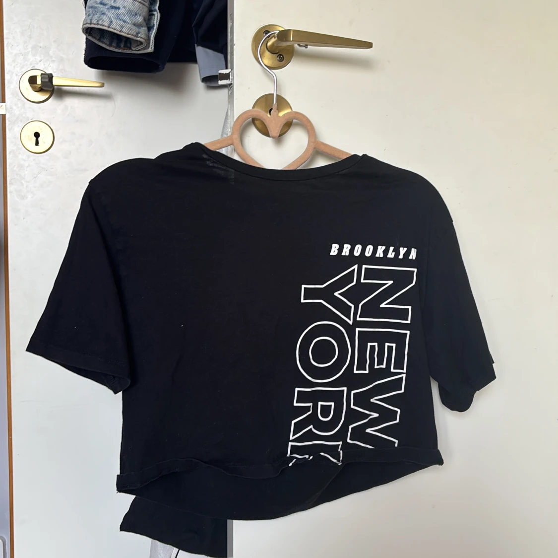 Svart croppad t-shirt från H&M med stort vitt tryck på framsidan där det står 'Brooklyn New York'. T-shirten storlek 146-152 10-12