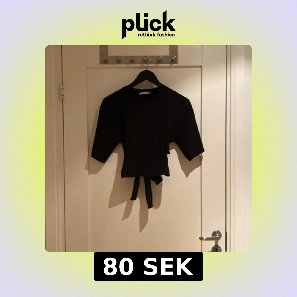 Svart croppad topp från 157 i storlek XS. Modellen har halvlånga ärmar och ett snyggt knyt i ryggen som ger en cool siluett. T-shirten är enkel och stilren, perfekt för att matcha med höga jeans eller kjol. Materialet är mjukt och känns skönt mot huden.