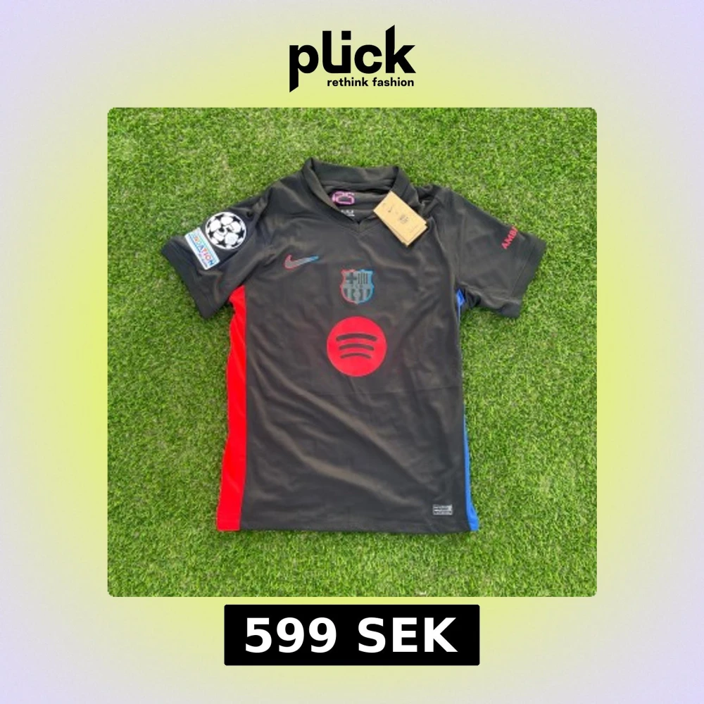 Säljer en svart FC Barcelona fotbollströja med röda och blå sidopaneler, klubbmärke på bröstet och stor röd Spotify-logga. Nike-logga på bröstet och Champions League-märke på ärmen. Namn och nummer 'Lamine Yamal 19' på ryggen.