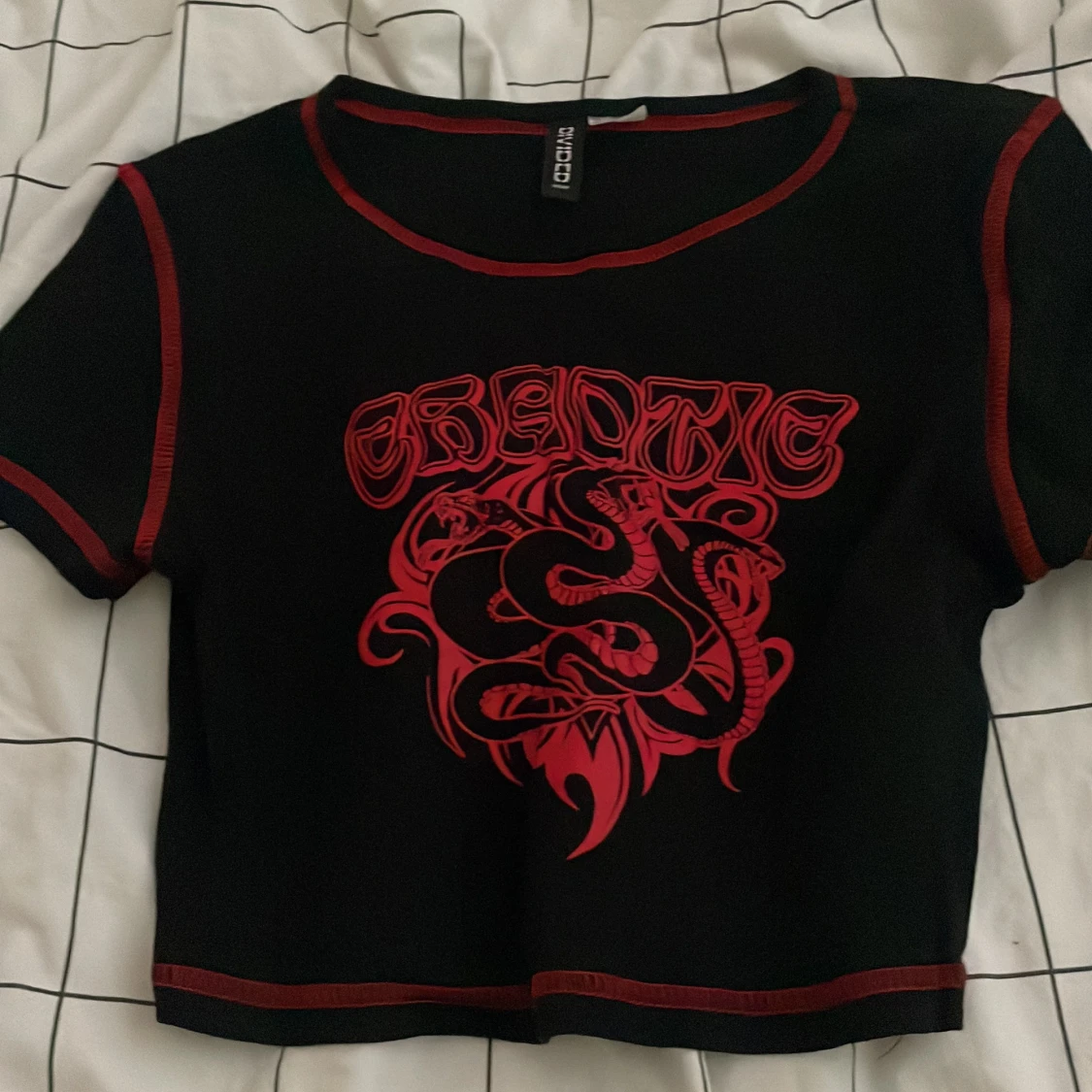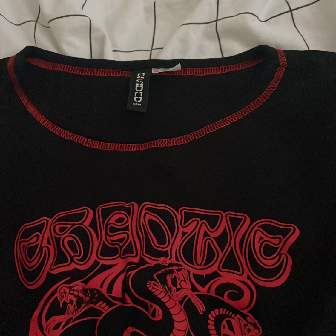 En svart crop topp ifrån h&m som har en röd text där det står ”chaotic”