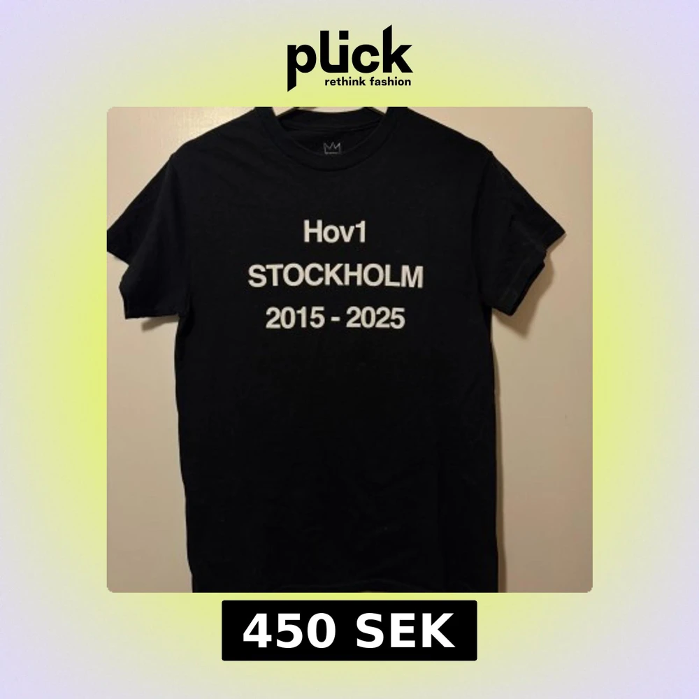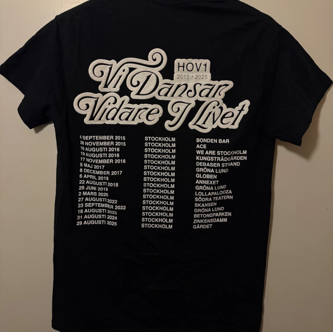 Svart t-shirt från Hov1 med vit text fram och bak. Framsidan har tryck med 'Hov1 STOCKHOLM 2015-2025' och baksidan listar turnédatum och platser samt texten 'Vi Dansar Vidare I Livet'.