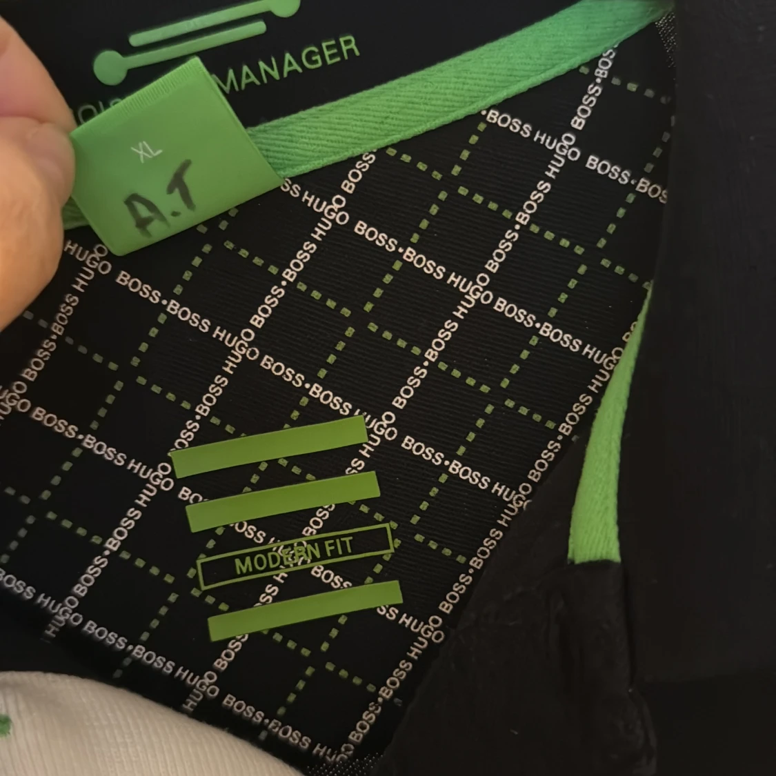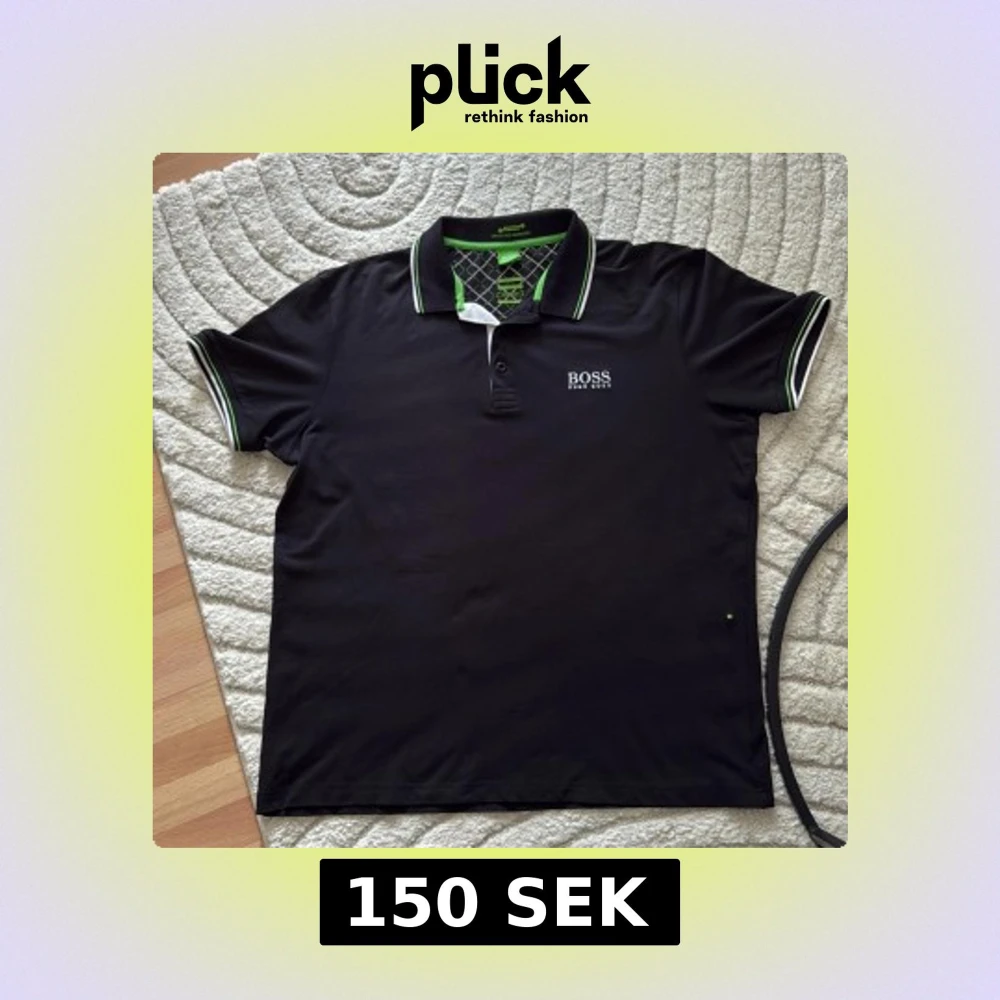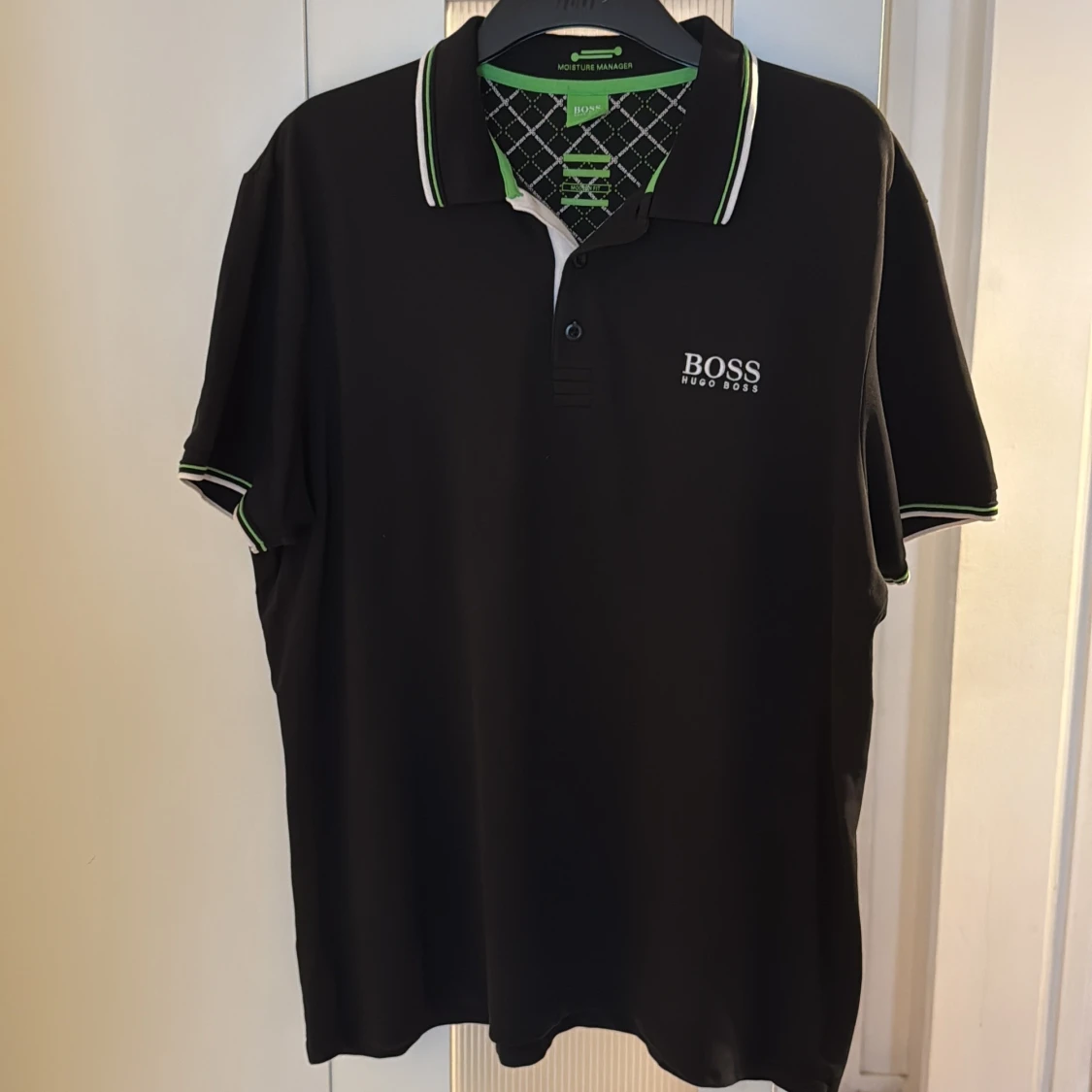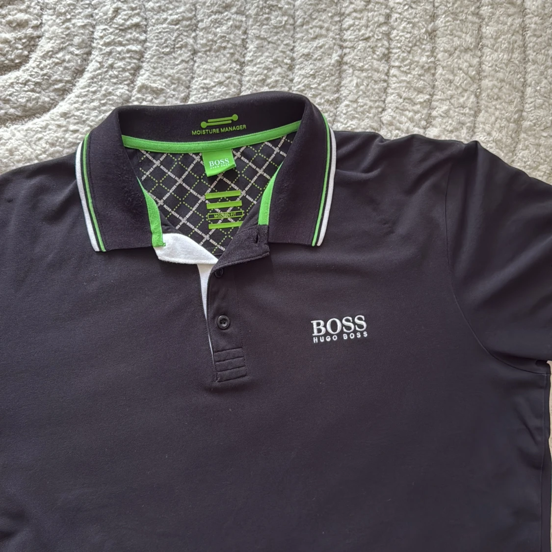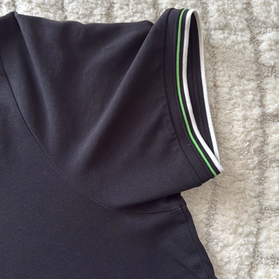 Svart pikétröja från Hugo Boss med vit och grön detalj på krage och ärmslut. Klassisk polokrage med knappar och broderad logga på bröstet. Tillverkad i polyester för en sportig känsla och fukttransport. Perfekt för en clean och stilren look.