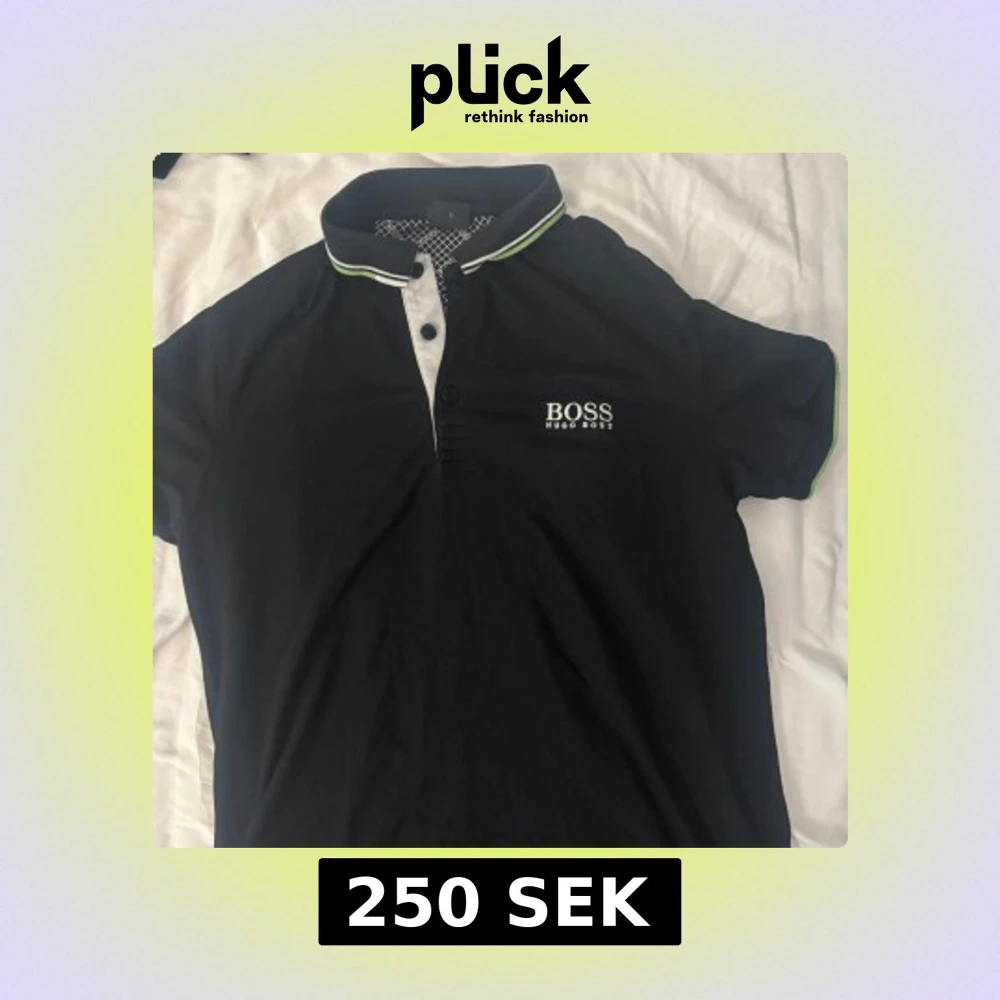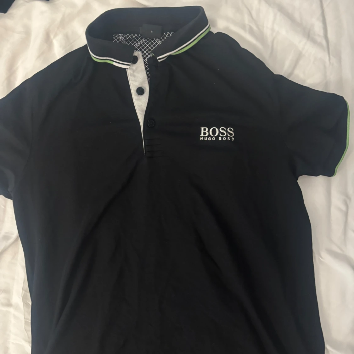 Svart t-shirt från Hugo Boss med vit knappslå och krage med gröna och vita detaljer. Kortärmad modell med BOSS-logga broderad på bröstet. Snyggt mönstrad insida vid halsen och klassisk passform. Perfekt för dig som gillar stilrena märkesplagg.