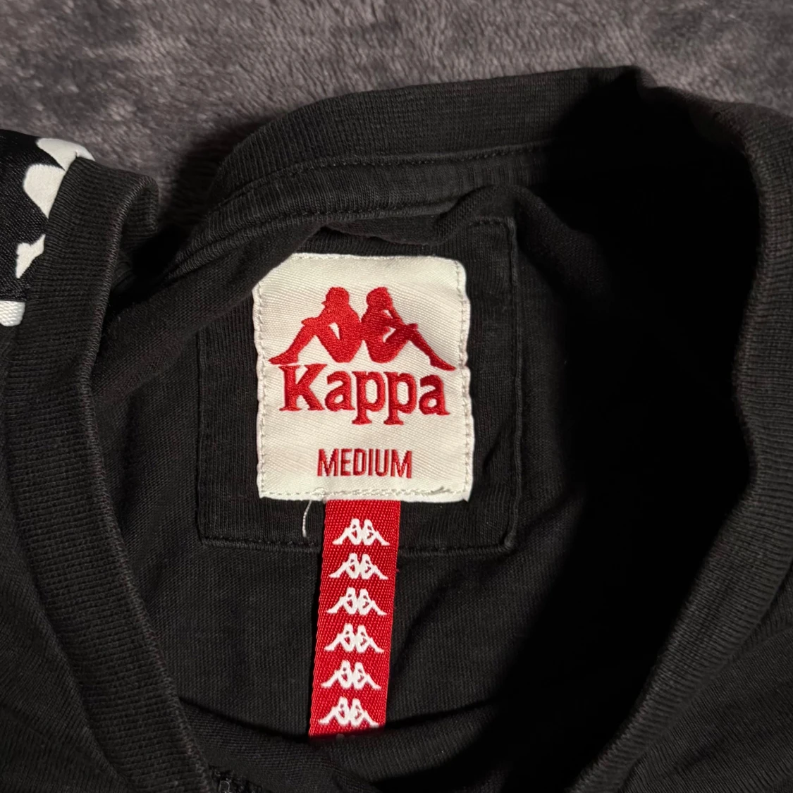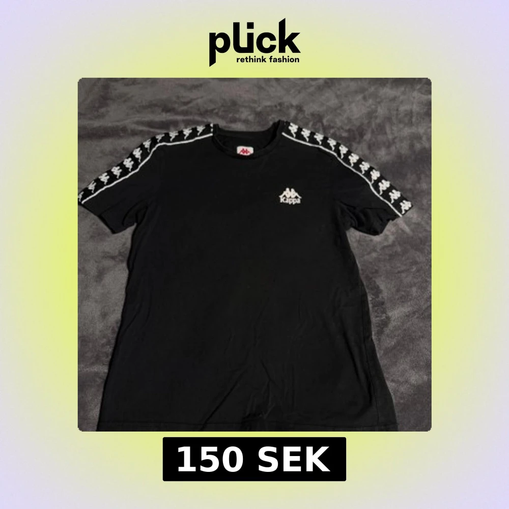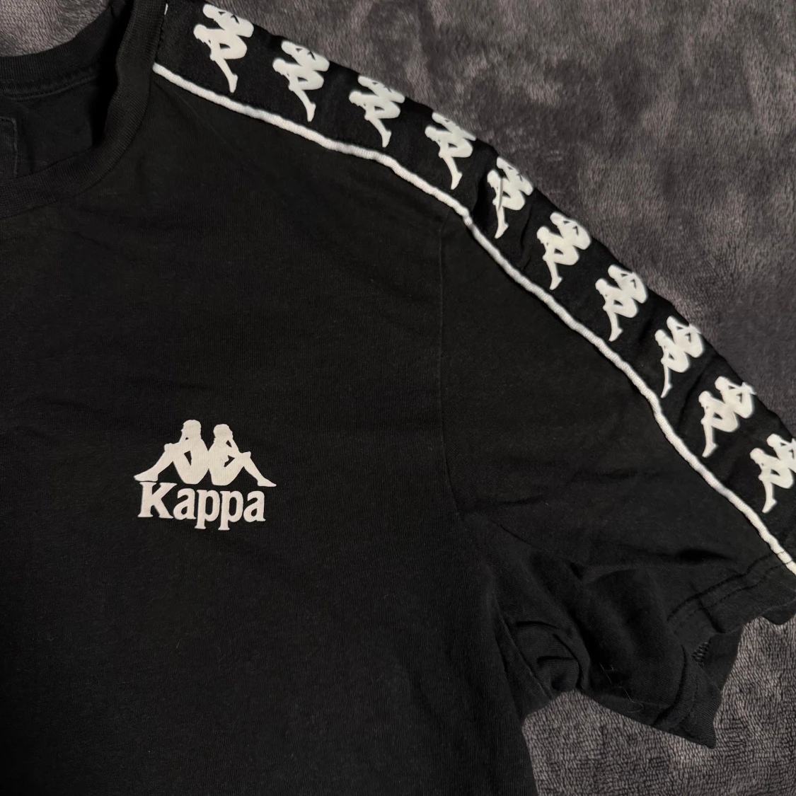 Svart t-shirt från Kappa i bomull med klassiskt logoband i vitt längs axlarna och ärmarna. Kappa-logga tryckt på bröstet. Enkel och sportig design som passar perfekt till streetwear eller chill vardagsstil. Jag köpte en t-shirt på herravdelningen, men den passar som unisex. Jag är en tjej som är 170-172 cm lång.