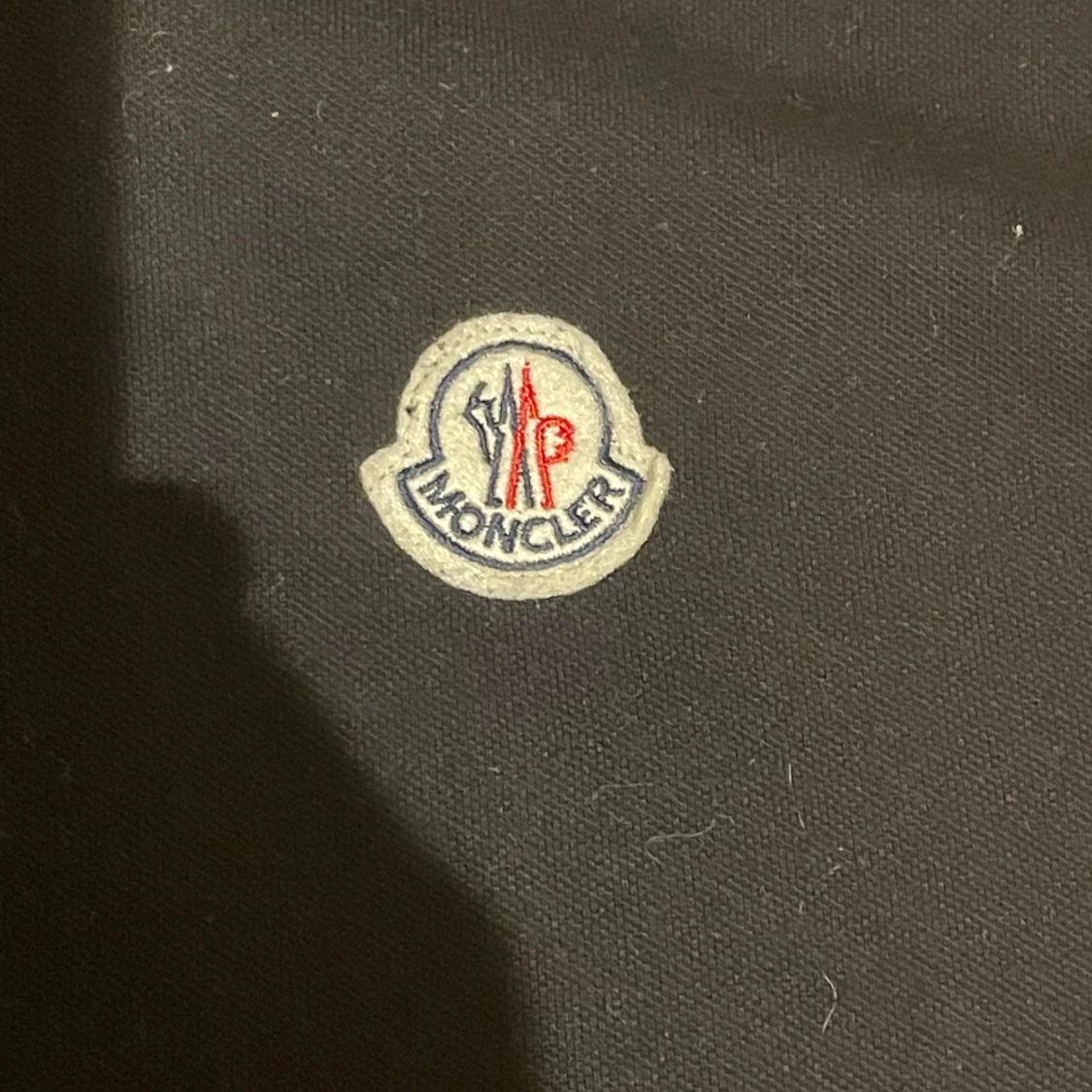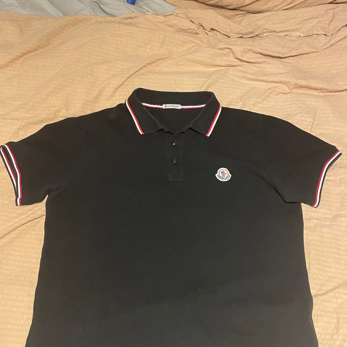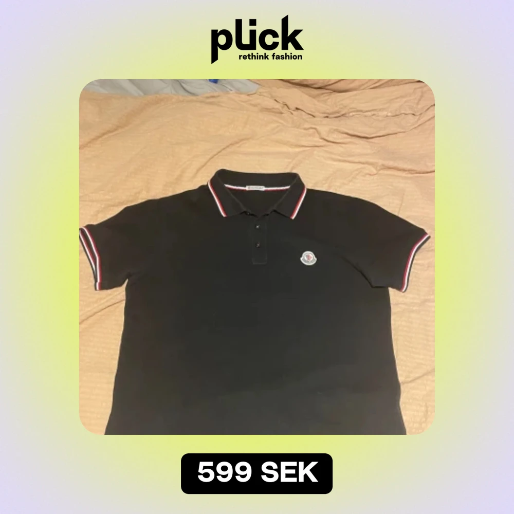 Säljer en snygg svart pikétröja 1: 1. Den har korta ärmar och en klassisk krage med röd och vit rand. Moncler-loggan är broderad på bröstet. Perfekt för en stilren och avslappnad look.