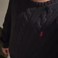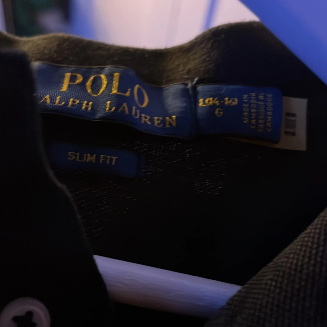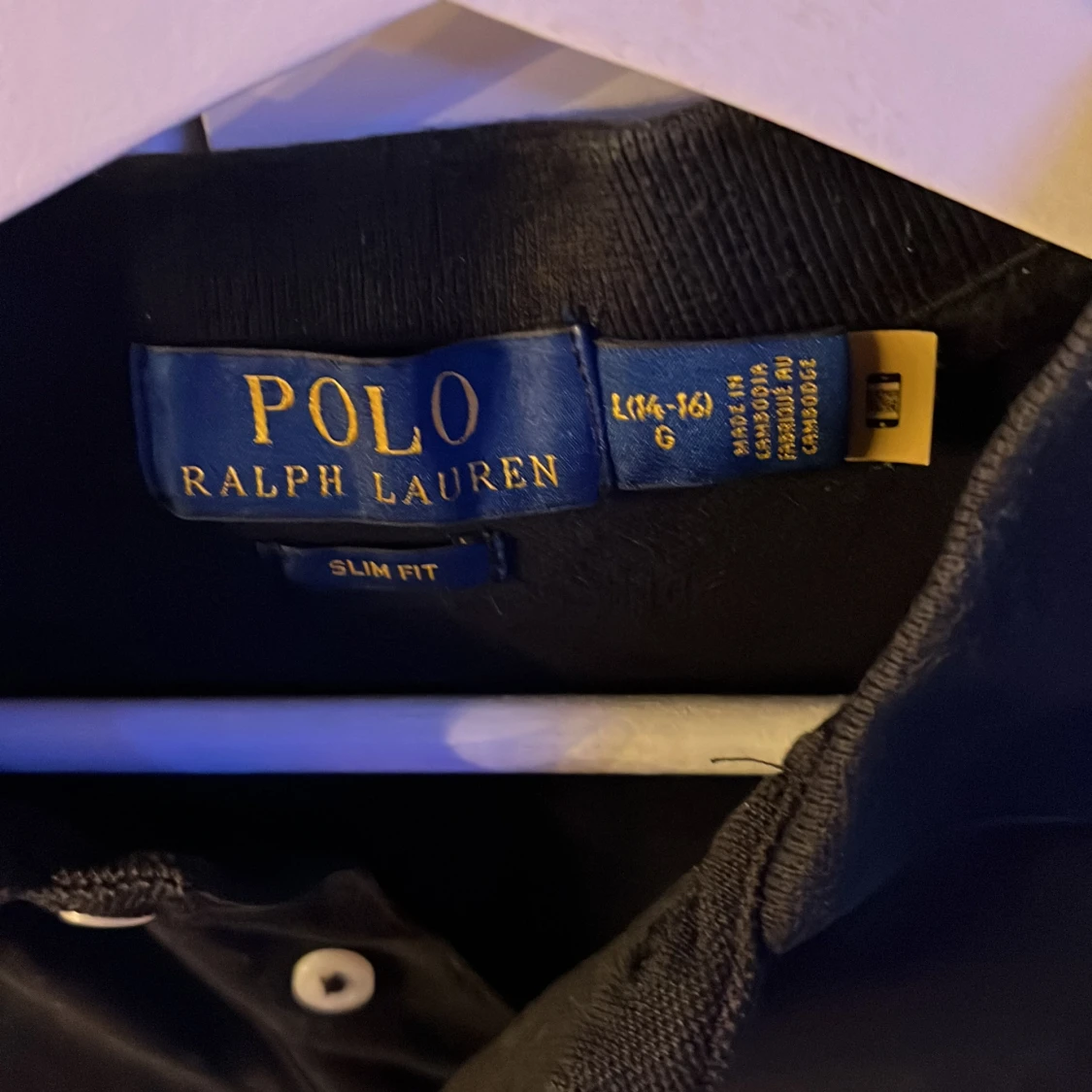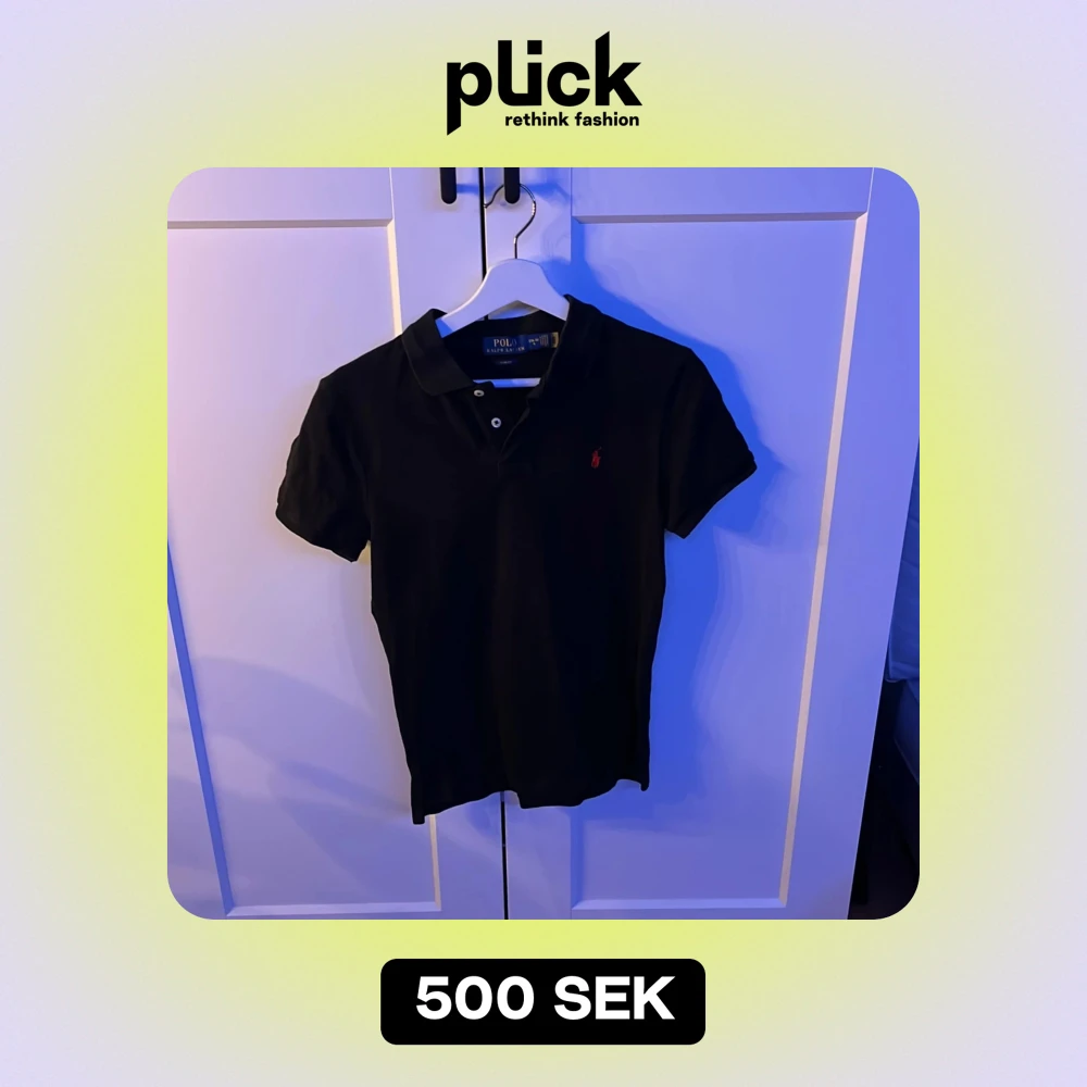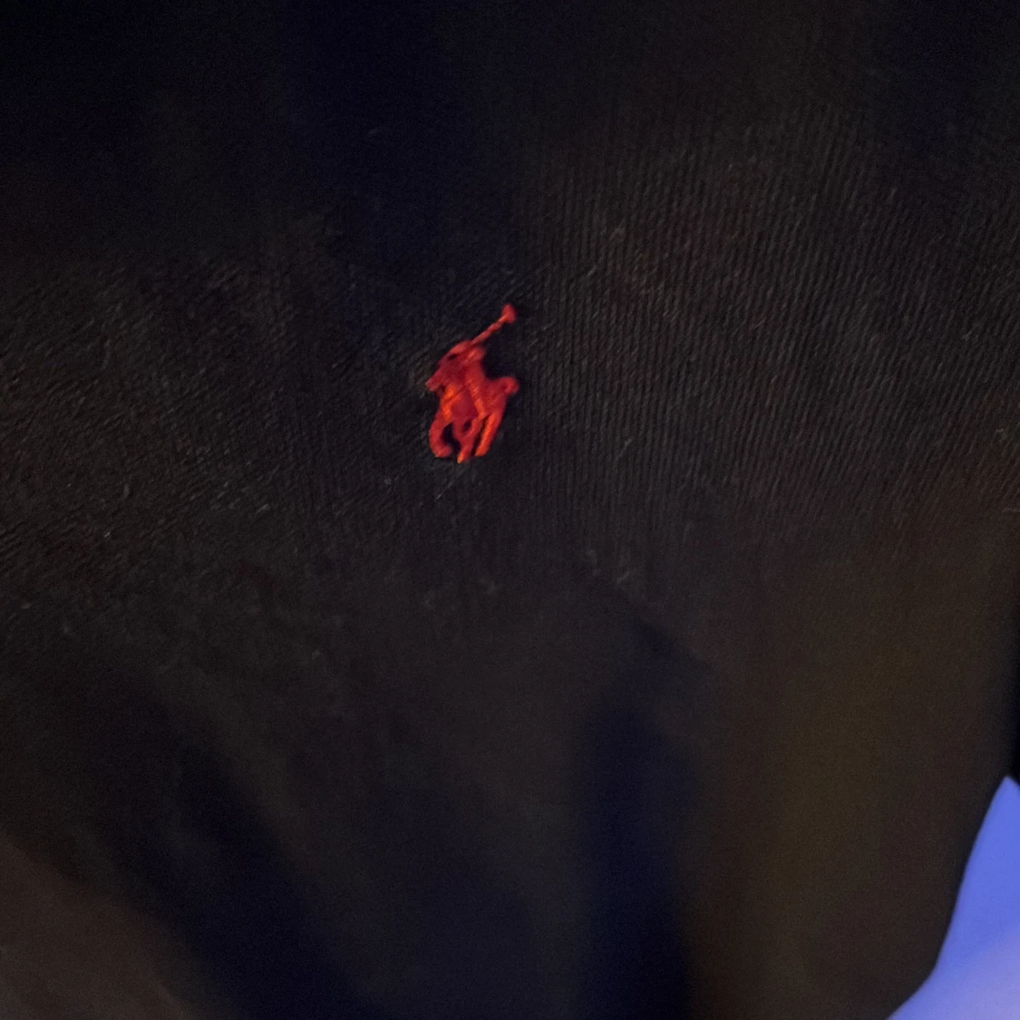 Säljer en stilren svart pikétröja från Ralph Lauren med röd broderad logga på bröstet. Tröjan har en slim fit passform och korta ärmar, perfekt för en klassisk look.