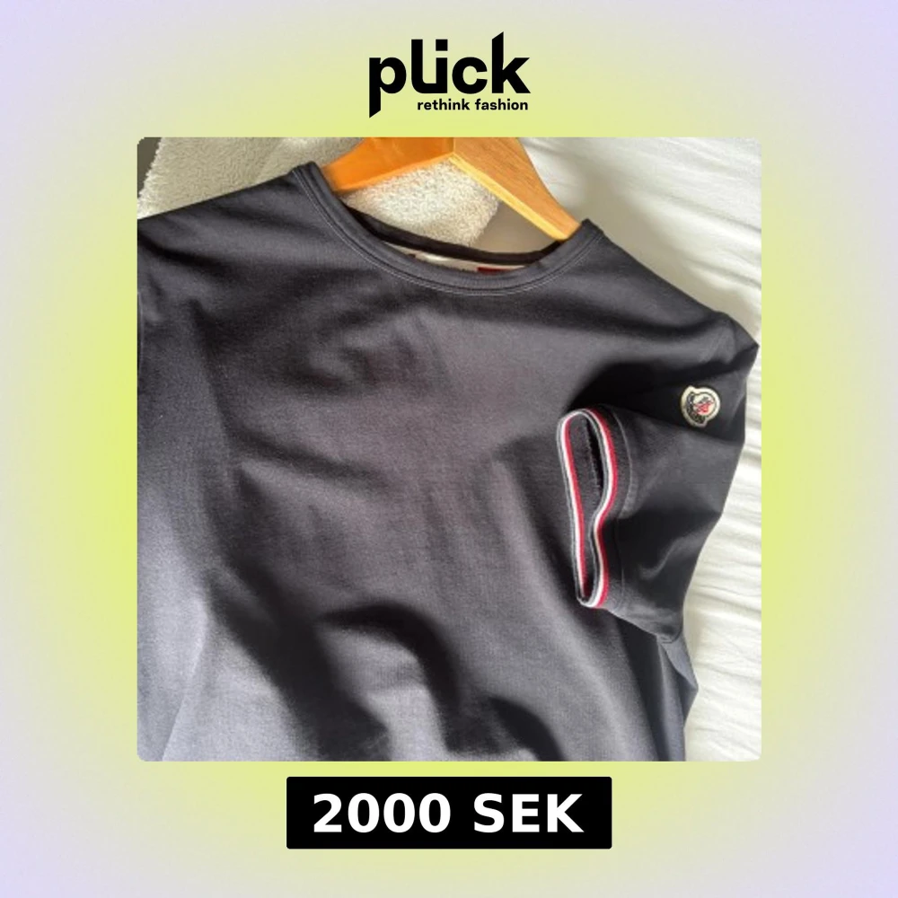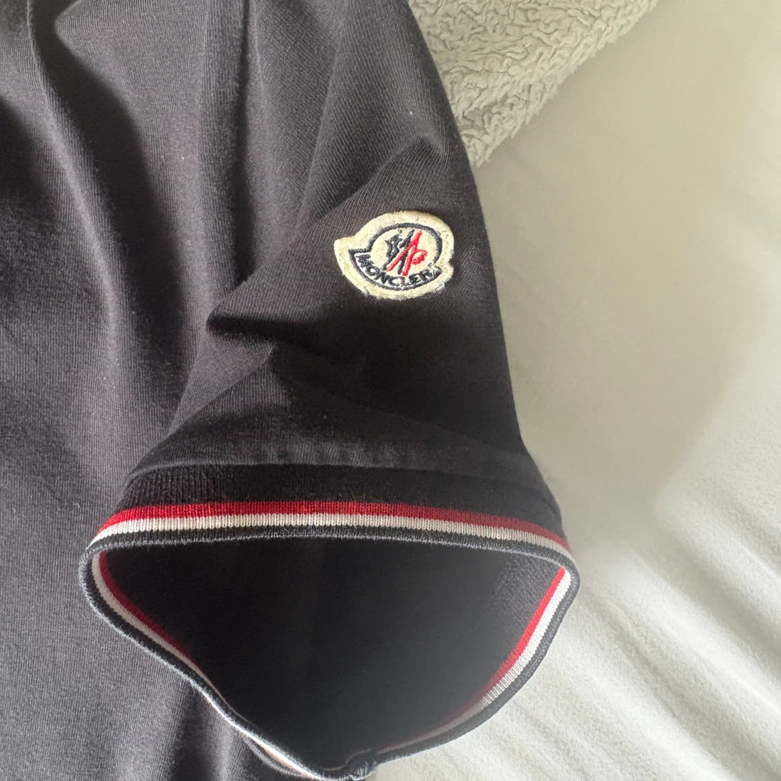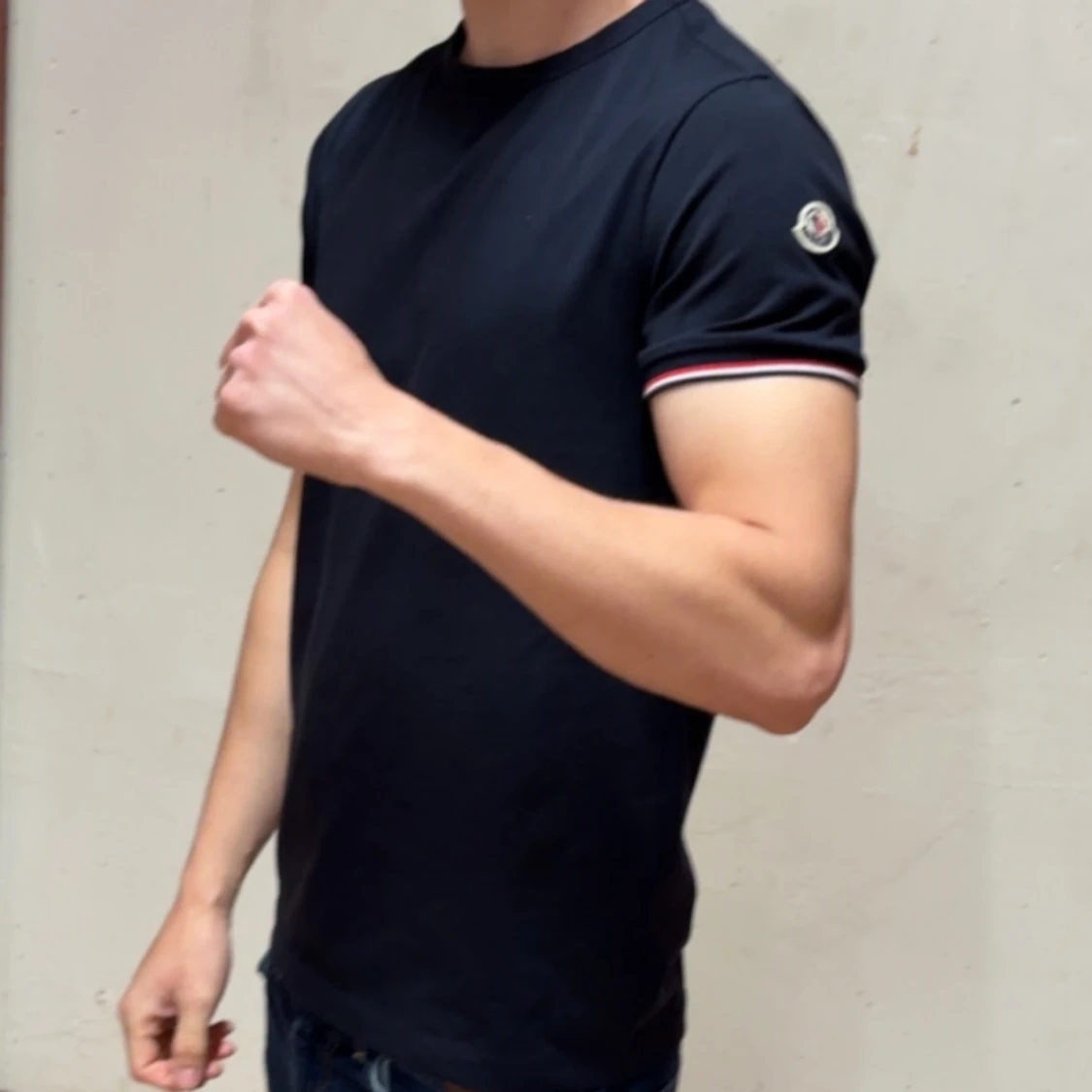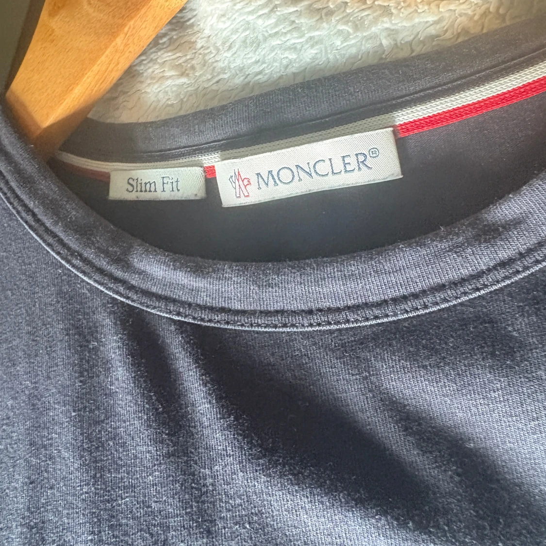 Svart t-shirt från Moncler med klassisk rund hals och korta ärmar. Ärmslutet har snygga ränder i rött, vitt och marinblå samt Moncler-logga på vänster ärm. Tillverkad i mjuk bomullsblandning för skön passform. Nypris 3000kr på Nk. Kvitto finns