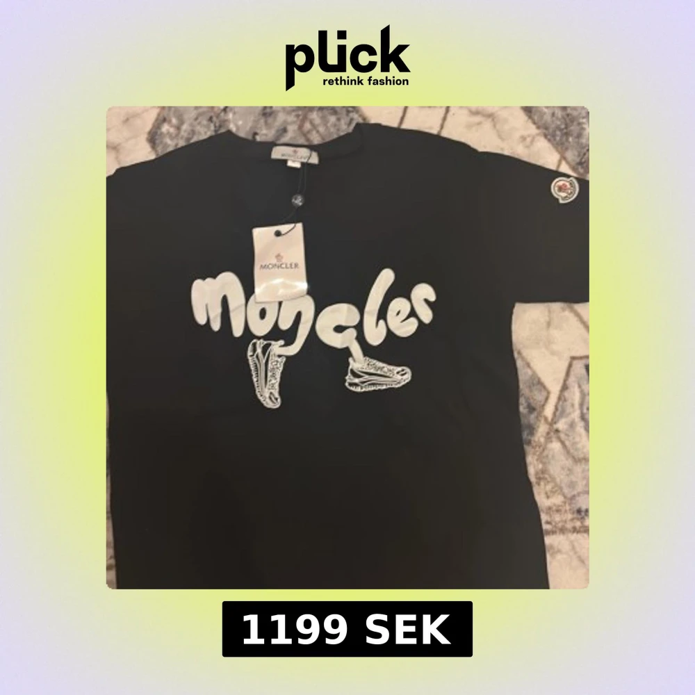 Svart t-shirt från Moncler med coolt vitt tryck framtill där loggan är stylad med sneakers. Klassisk rund hals och korta ärmar. Moncler-märke på ärmen. Perfekt för dig som gillar streetstyle och vill sticka ut. Priset kan diskuteras!!