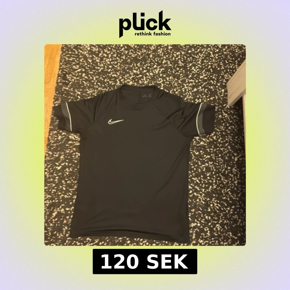 Svart Nike Dri-Fit t-shirt i storlek L med vit broderad swoosh på bröstet. Tillverkad i ett lätt och snabbtorkande syntetmaterial, perfekt för träning. T-shirten har korta ärmar och diskreta grå detaljer på ärmsluten för en sportig look.