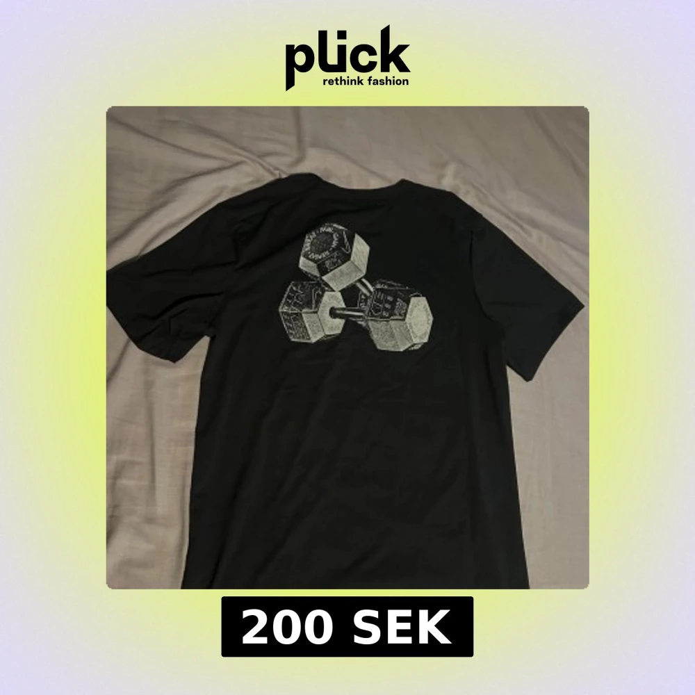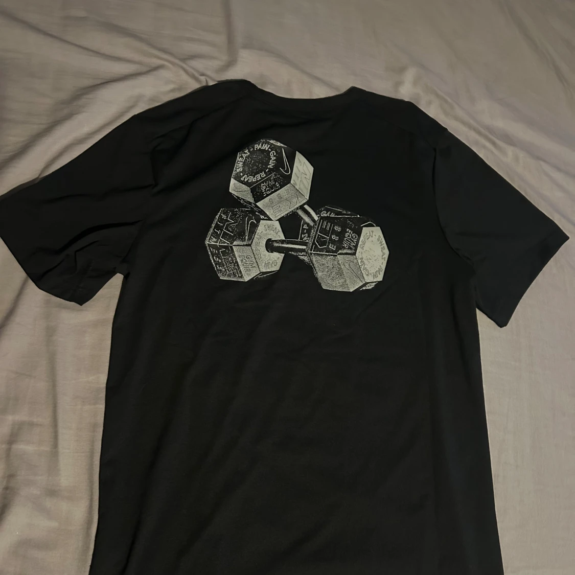 Svart Nike Dri-Fit t-shirt i sportig modell med korta ärmar. Framsidan har en liten Nike-logga och baksidan är dekorerad med ett coolt tryck av två hantlar. Tillverkad i funktionsmaterial som andas och passar perfekt till gymmet.