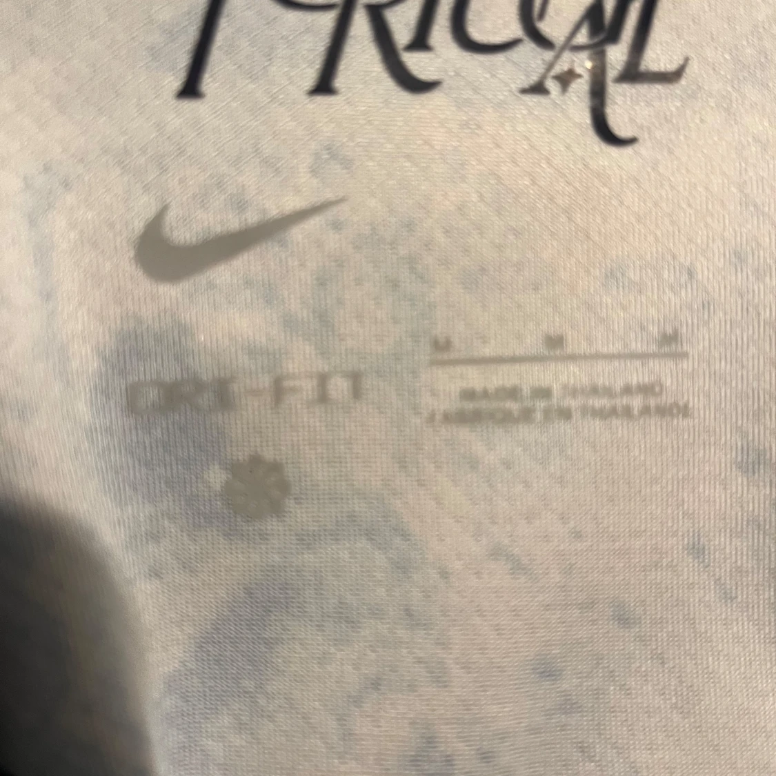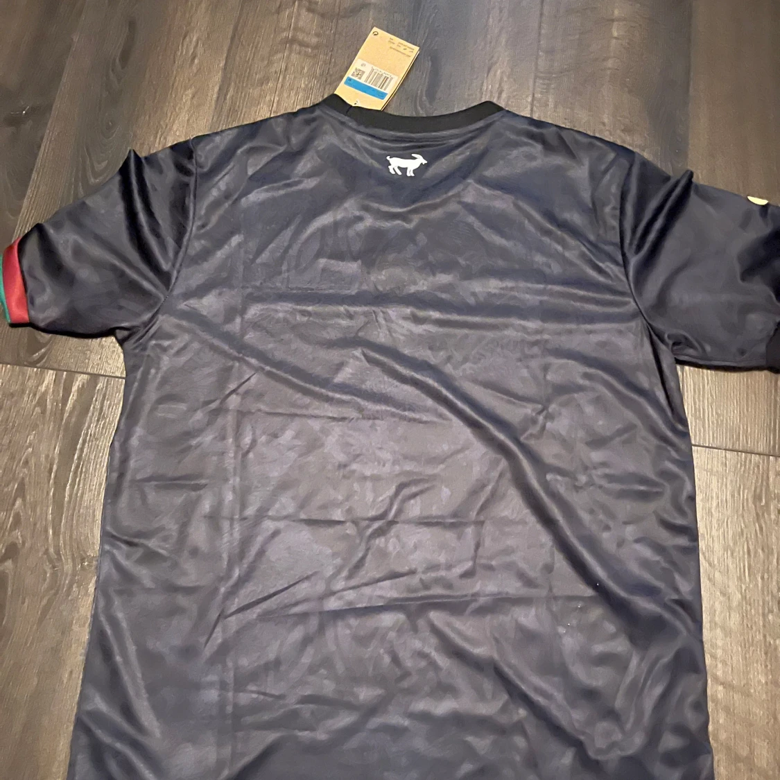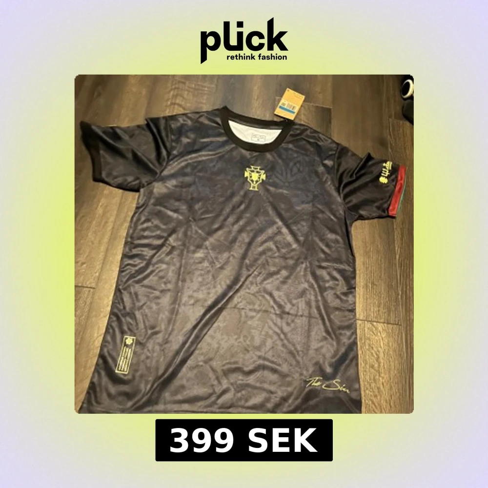 Säljer en svart fotbollströja från Nike med guldiga detaljer och tryck. Tröjan har korta ärmar, rund hals och diskreta mönster i tyget. Märket syns på bröstet och det finns även små röda detaljer på ärmsluten.