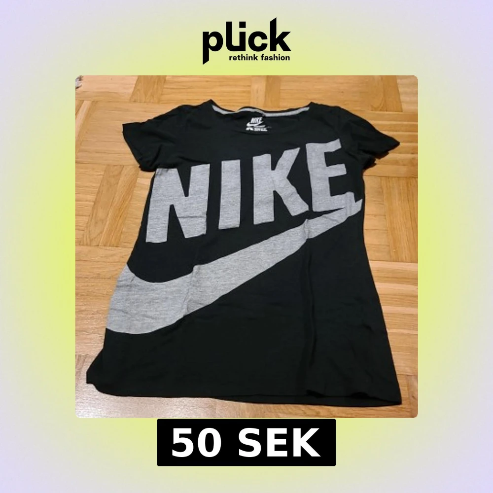 Svart t-shirt från Nike i storlek S med en stor grå Nike-logga och swoosh på framsidan. Regular fit och tillverkad i mjuk bomull. Klassisk rund hals och korta ärmar, perfekt för en sportig och avslappnad stil.