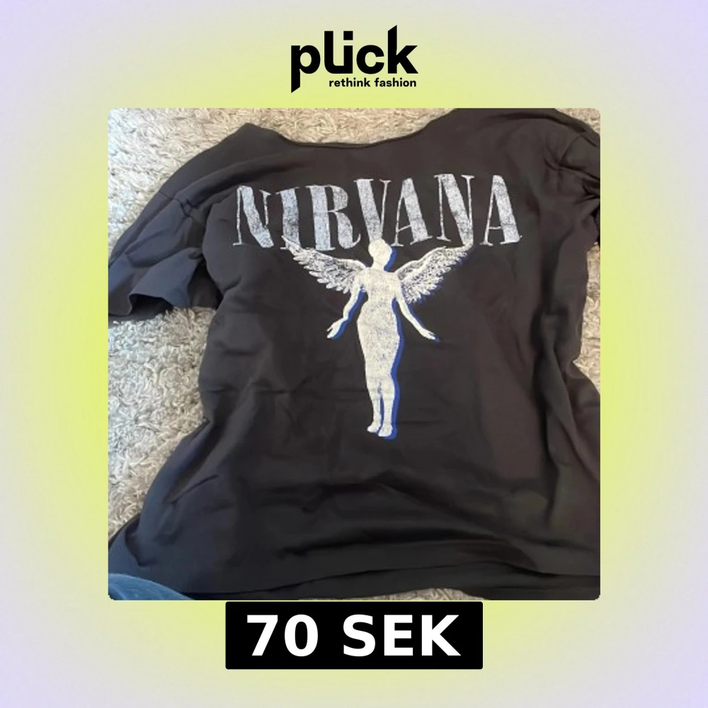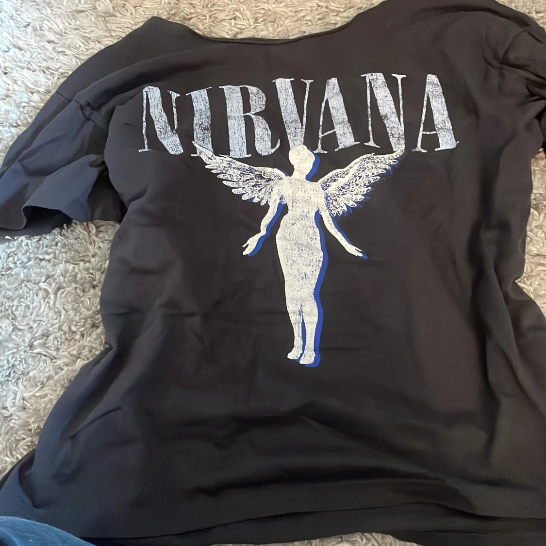 Cool svart t-shirt med Nirvana-tryck på framsidan. Designen har en ikonisk ängel i vitt och blått. Perfekt för fans av bandet och en grymt snygg detalj i garderoben.