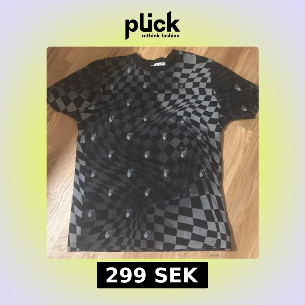Säljer en svart och grå t-shirt från Off-White med ett unikt rutigt mönster som ger en cool optisk illusion. T-shirten har korta ärmar och är tillverkad i mjuk bomull. Off-White-loggor och handmotiv är tryckta över hela plagget. Perfekt för dig som vill sticka ut.