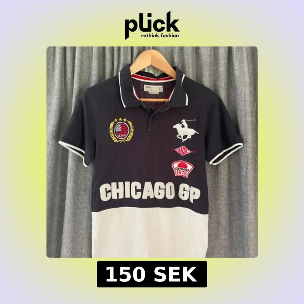 Säljer en svart och vit pikétröja från USPA med broderade märken och tryck på bröstet samt texten 'CHICAGO GP' framtill. Tröjan har krage, korta ärmar och kontrastfärgade detaljer vid ärmslut och krage.