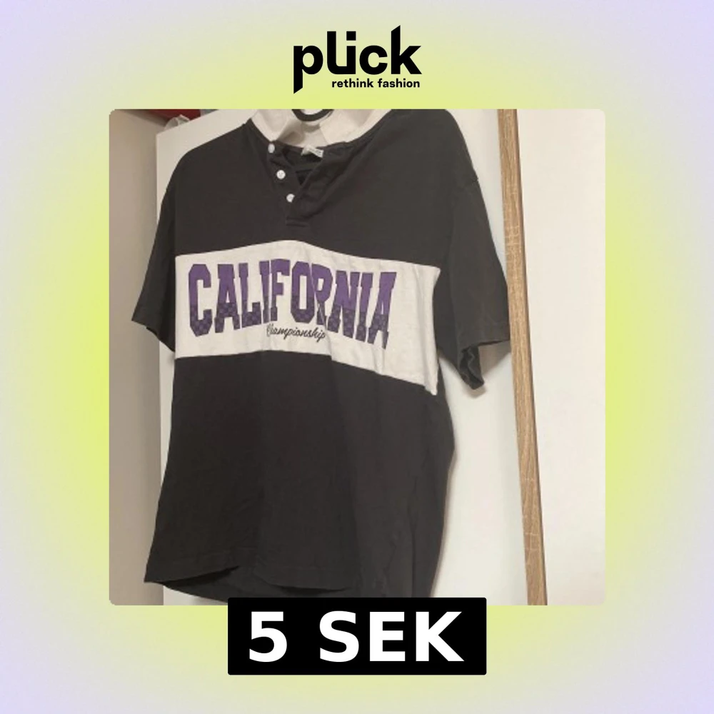 Cool t-shirt från H&M i svart och vitt med stor lila 'CALIFORNIA' print över bröstet. T-shirten har korta ärmar, vit krage och knappar vid halsen. Tillverkad i 100% bomull för en skön känsla. Perfekt för dig som gillar sportig och avslappnad stil. Säljer för otroligt lågt pris 👍