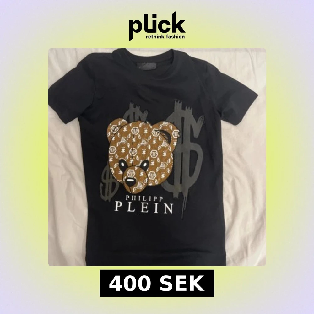 Svart t-shirt från Philipp Plein med korta ärmar och normal passform. Framsidan har en stor björn i brunt med vita loggor och svarta detaljer, samt stora grå dollarsymboler i bakgrunden. Materialet är mjuk bomull och trycket är detaljerat och sticker ut.