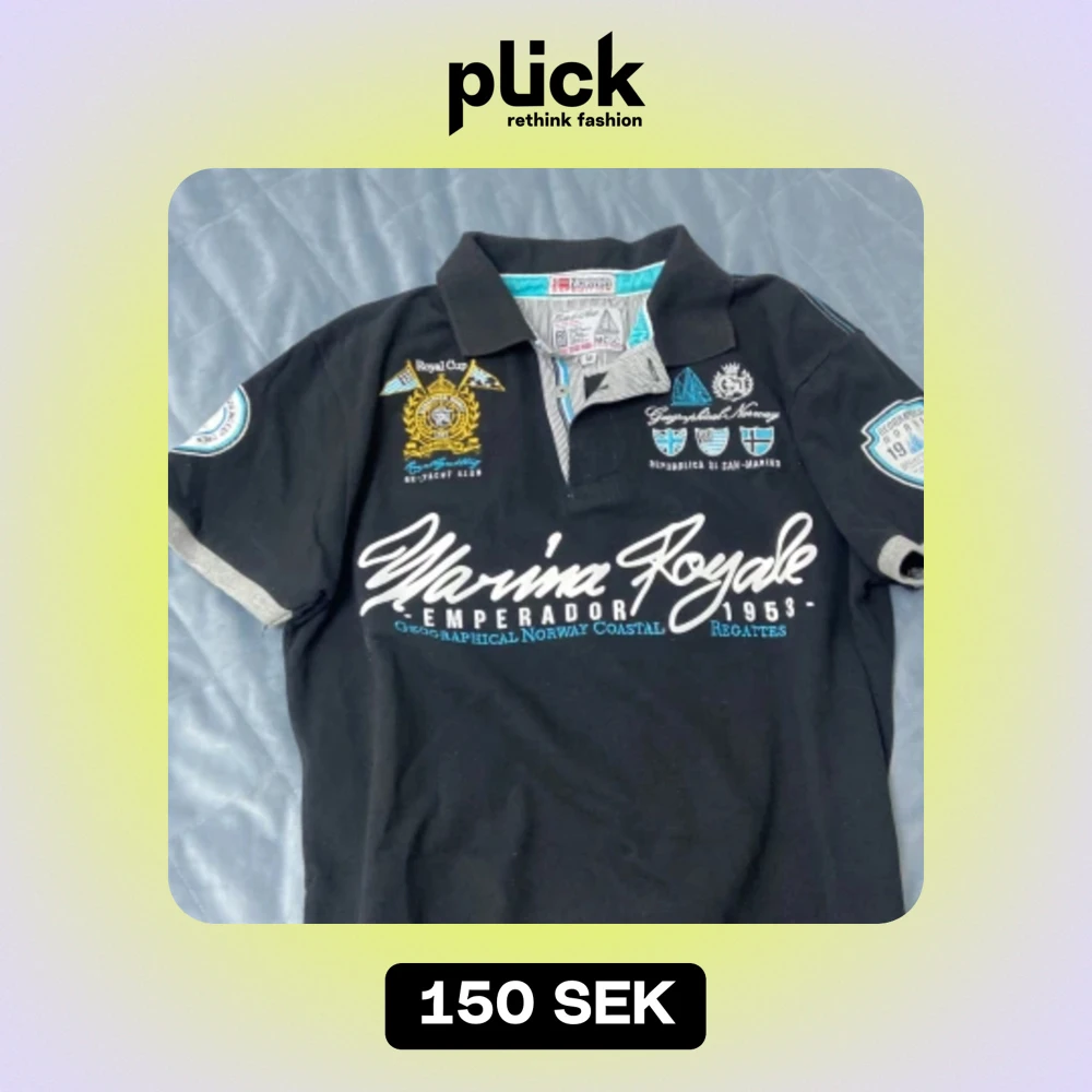 En svart pikétröja från Geographical Norway med broderade detaljer och text på både fram- och baksidan. Tröjan har korta ärmar med gråa kanter och en krage med turkos insida.