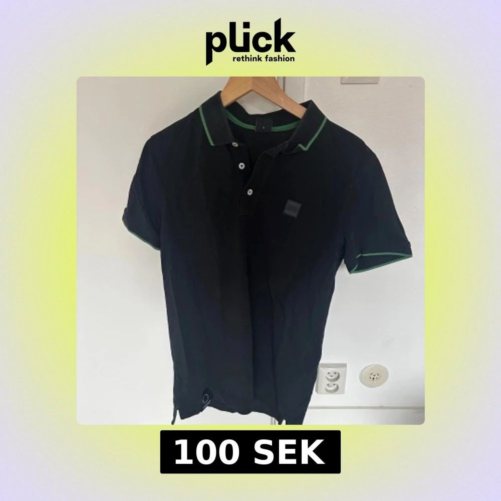 Säljer en svart pikétröja från Hugo Boss med gröna detaljer på krage och ärmslut. Tröjan har korta ärmar, knappar framtill och klassisk pikékrage. Perfekt för en stilren och sportig look.