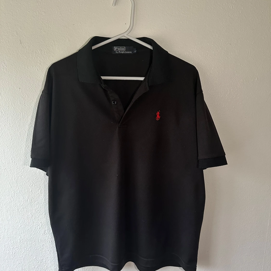 Snygg svart pikétröja från Ralph Lauren med klassisk krage och knappar. Den har en liten röd broderad logotyp på bröstet. Perfekt för en stilren look.