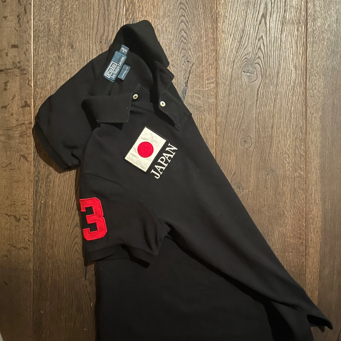 Snygg svart pikétröja från Ralph Lauren med röd logga och nummerdetalj på ärmen. Tröjan har en japansk flagga och texten 'Japan' på bröstet. Perfekt för en stilren look.