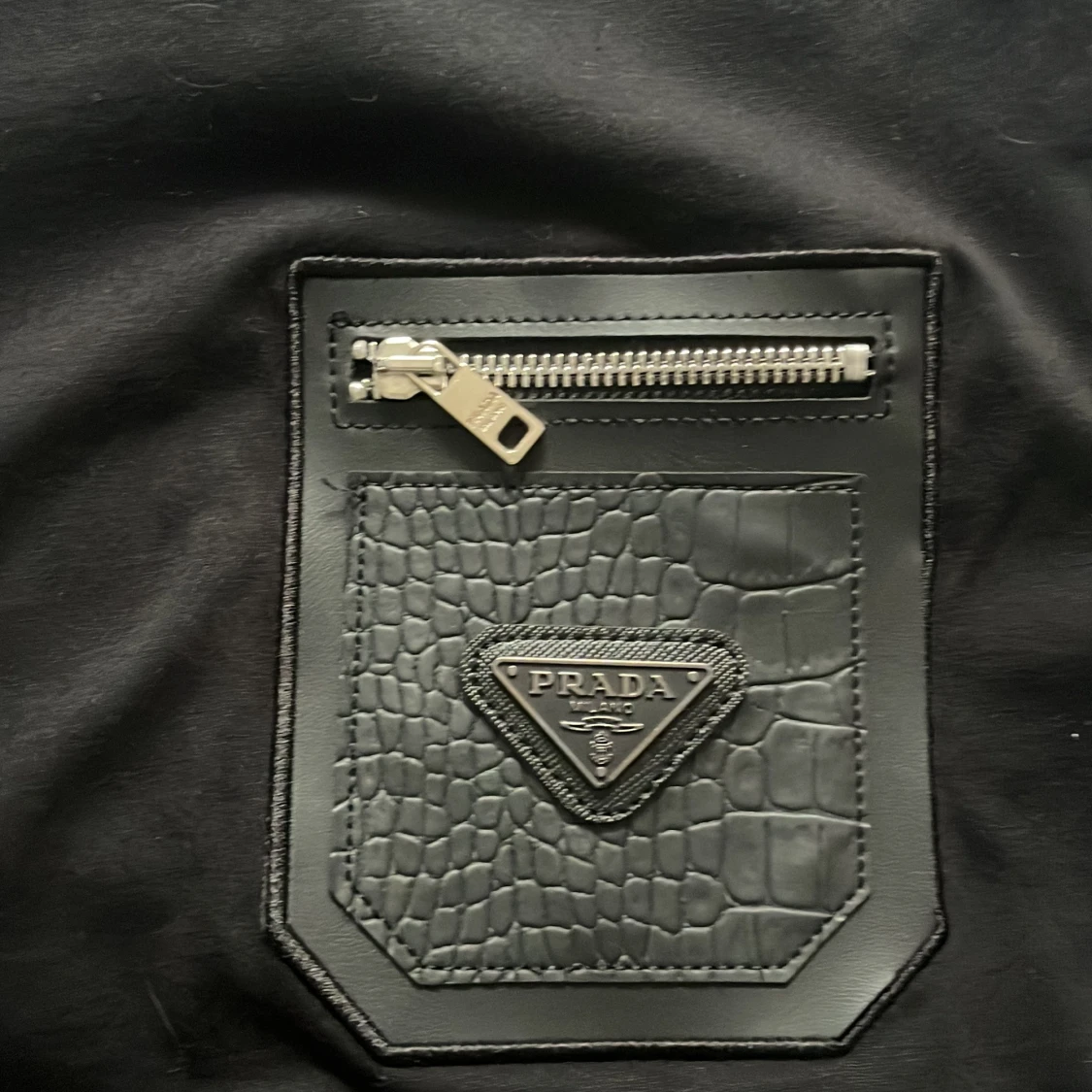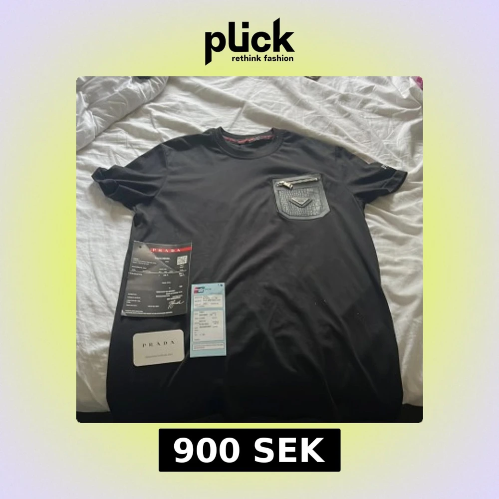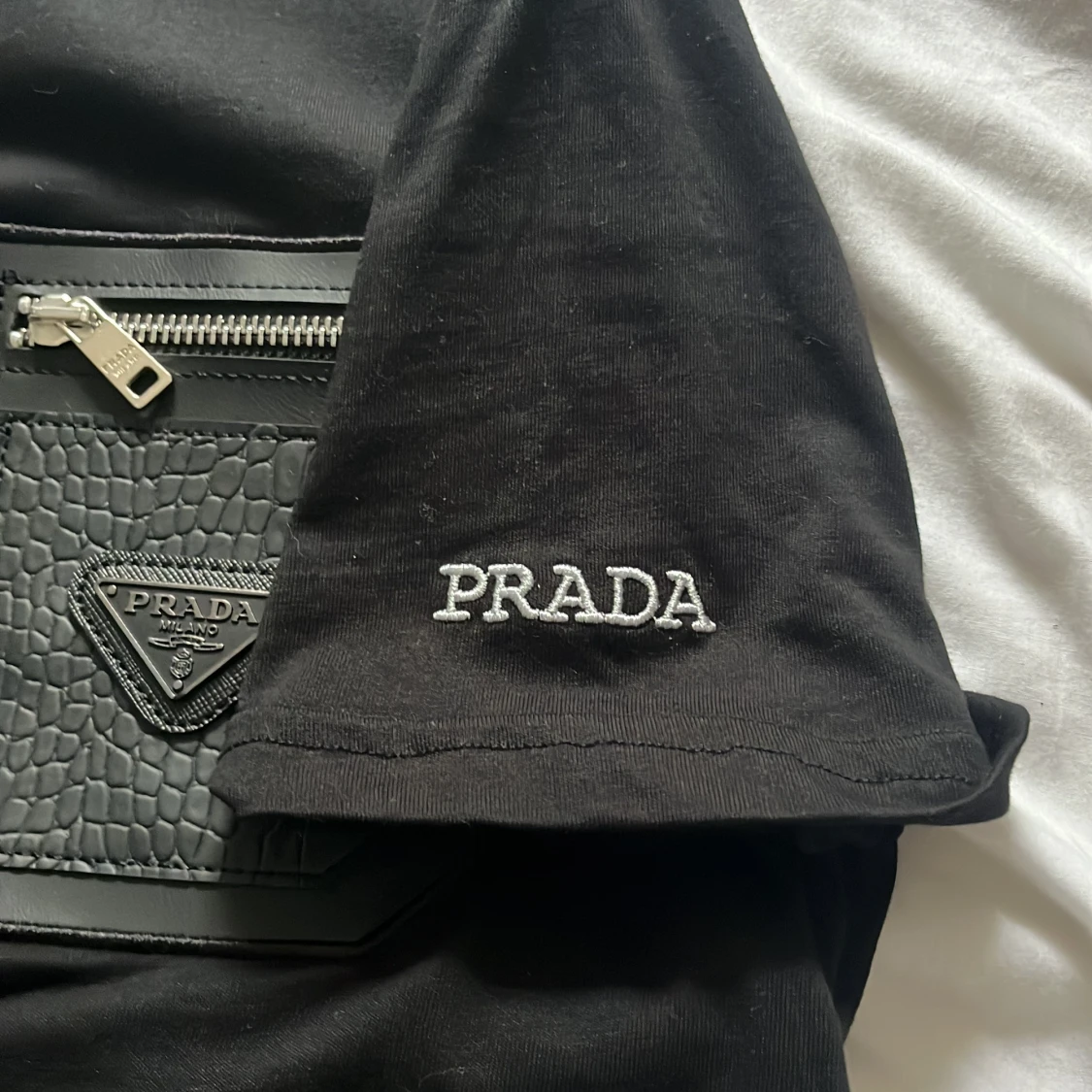 Exklusiv svart t-shirt från Prada med en unik läderficka på bröstet, prydd med Pradas metallogo och en snygg dragkedja. T-shirten har korta ärmar och en klassisk rund hals. Materialet är mjuk bomull och detaljerna ger en lyxig vibe.