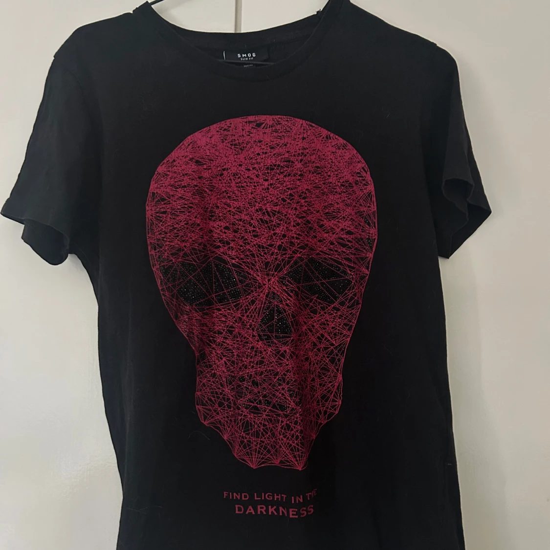En snygg svart T-shirt med en röd döskalle på. Har några stenar på trycket men några har fallit av, men inget man ser sådär jätte tydligt tycker jag! Vill man ha bild så är det bara att skriva!