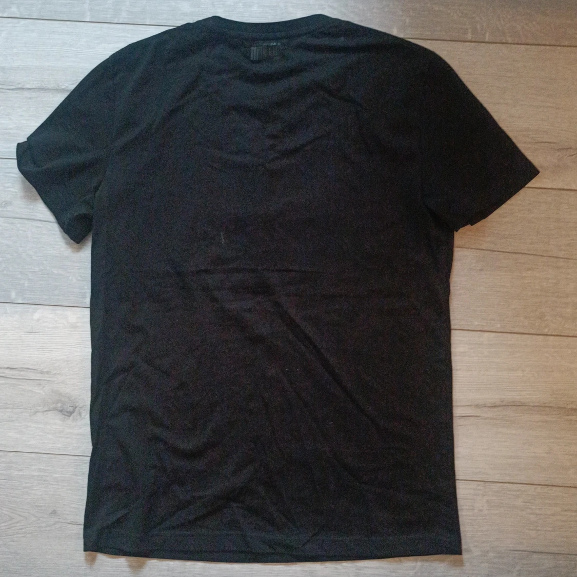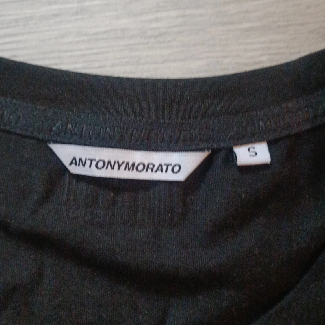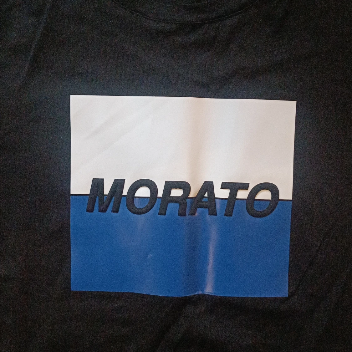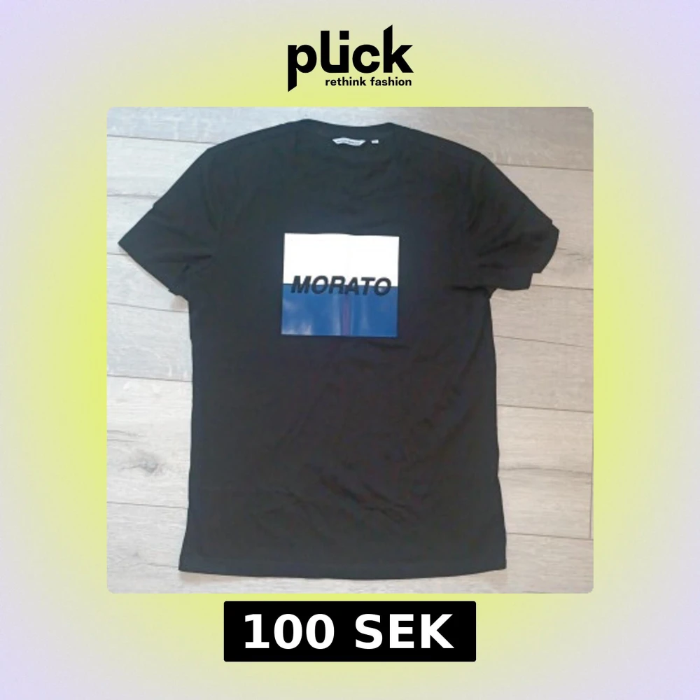 Svart t-shirt från Antony Morato i storlek S. Framsidan har en stor vit och blå fyrkantig print med texten 'MORATO' i svart. Klassisk passform med rund hals och korta ärmar. Tillverkad i mjuk bomull för en skön känsla. ALDRIG ANVÄND!