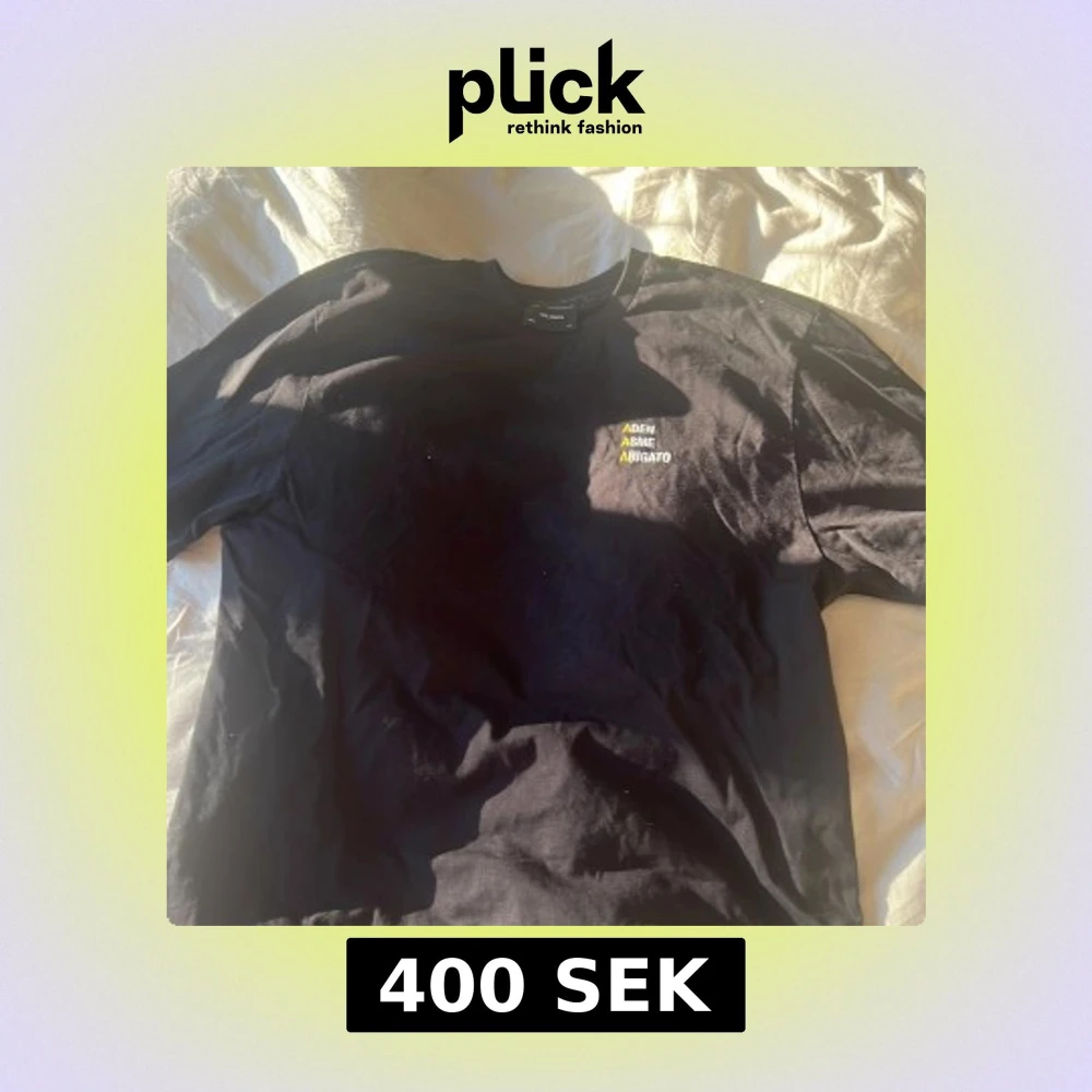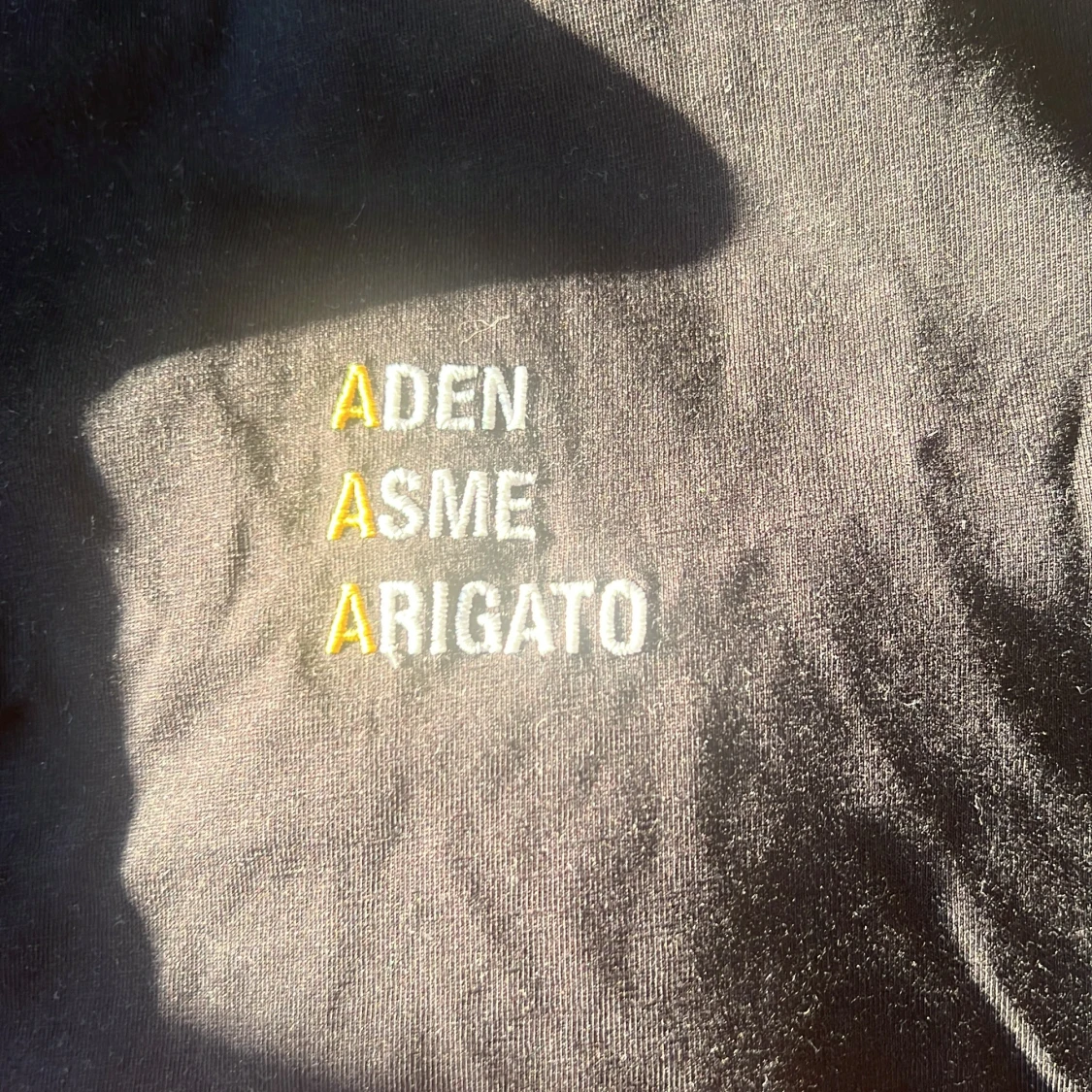 Svart t-shirt från Axel Arigato i 100% bomull. Klassisk passform med korta ärmar och rund hals. På bröstet finns broderad text i vitt och gult: 'ADEN ASME ARIGATO' med tre gula A. Perfekt för dig som gillar stilrena streetwear-plagg.