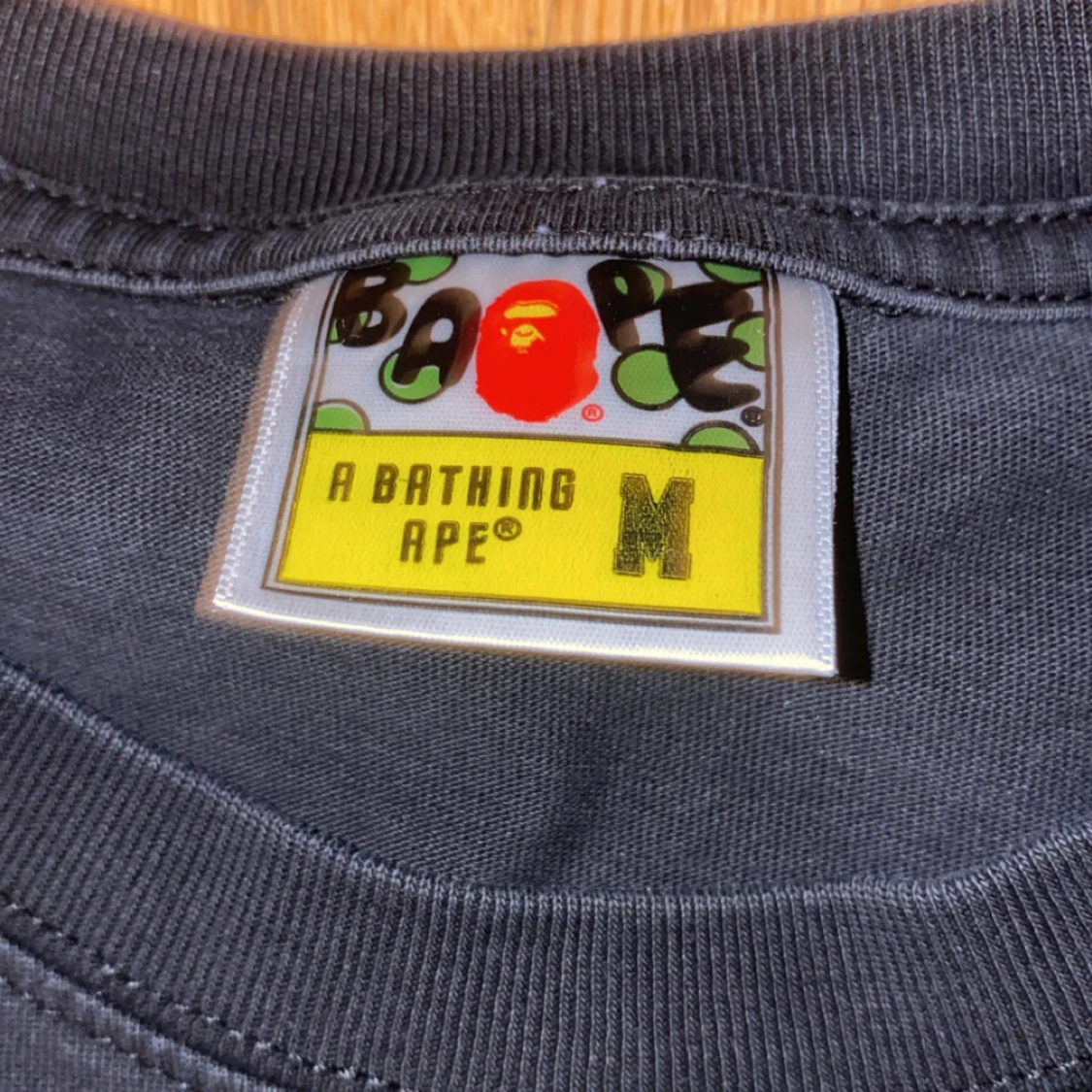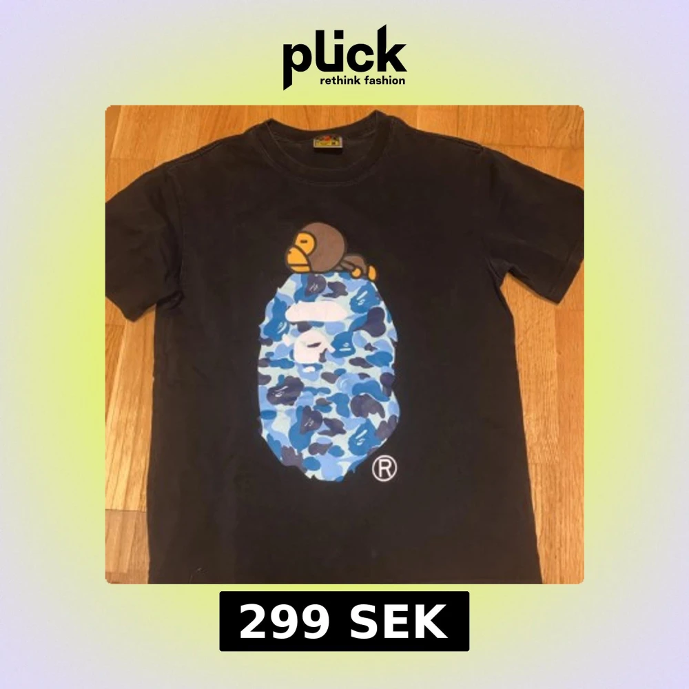 Säljer en svart t-shirt från A Bathing Ape med ett stort blått och vitt kamouflagemönster på framsidan. T-shirten har en kortärmad design och är tillverkad i bomull. Perfekt för dig som gillar streetwear och unika tryck. OBS 1 two 1 ‼️‼️‼️‼️Den har några små sträck i trycket men det syns inte. Det står M men passar S också. Hör av er vid funderingar!