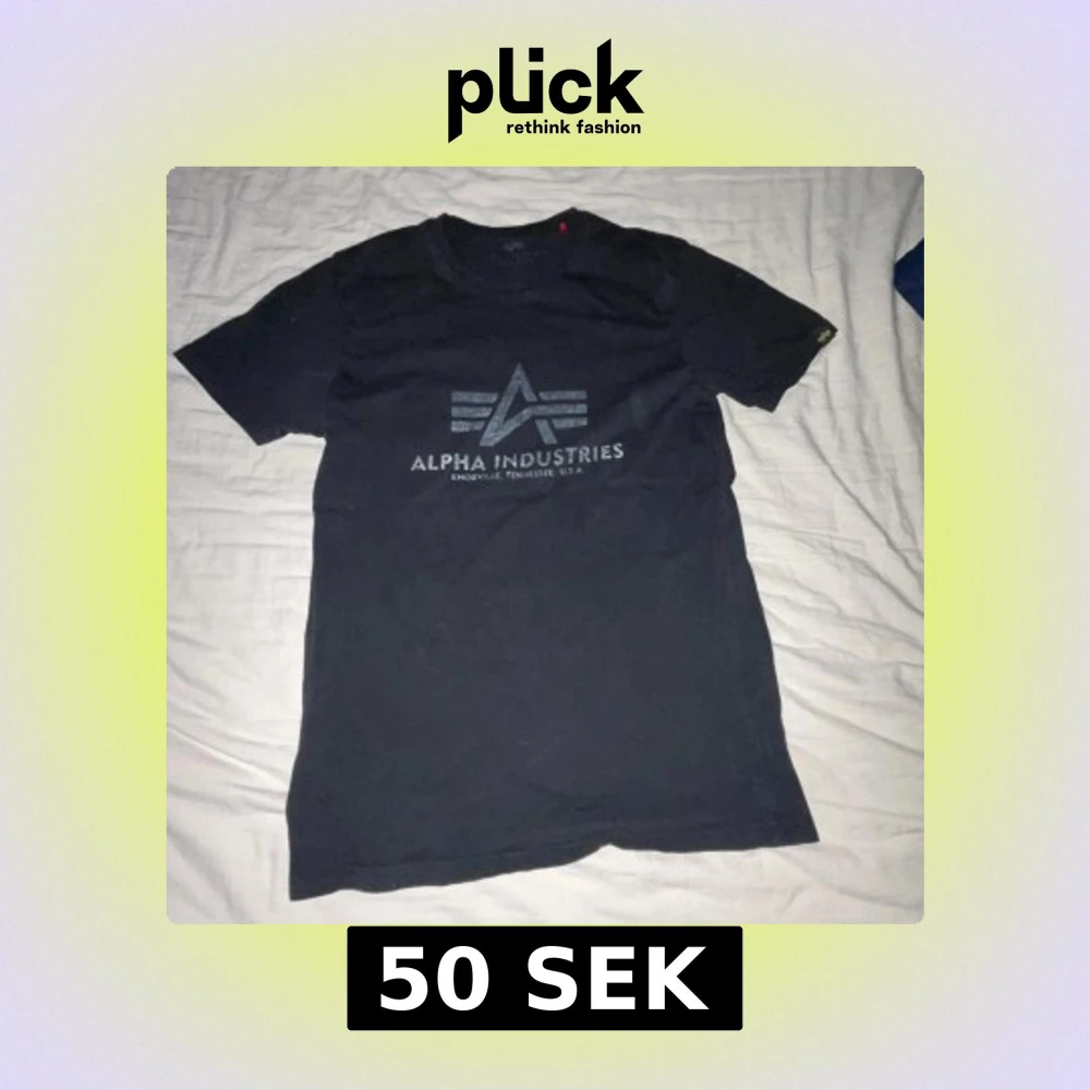 Säljer en svart t-shirt från Alpha Industries med tryck på framsidan. T-shirten har en klassisk rund hals och korta ärmar. Perfekt för en avslappnad stil.