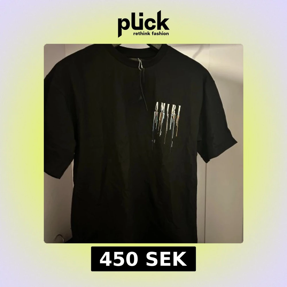 Säljer en svart t-shirt från Amiri med tryckt logga och färgstänk i vitt, blått och orange på både bröstet och ryggen. T-shirten har rund hals och korta ärmar. Perfekt för dig som gillar streetwear och vill sticka ut.
