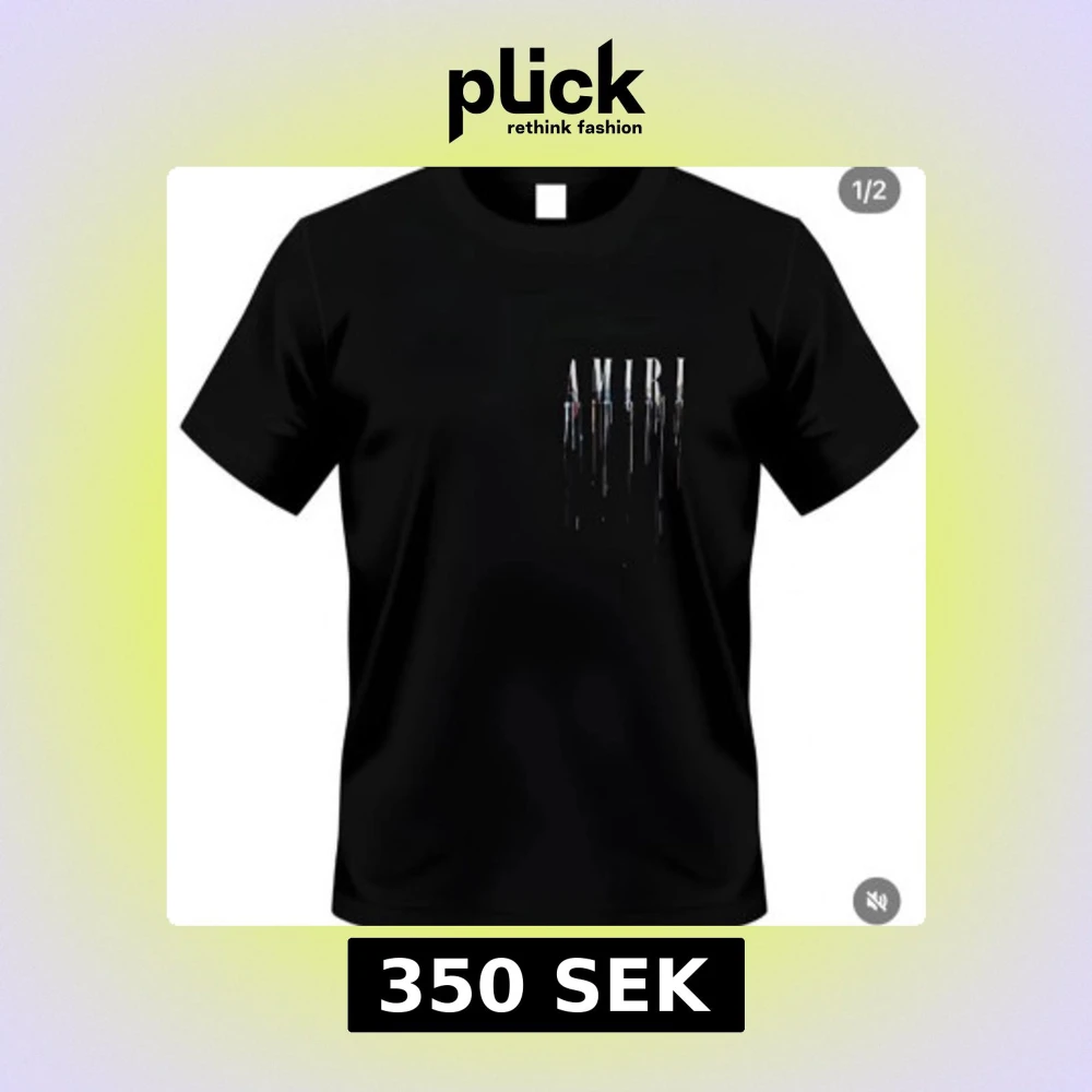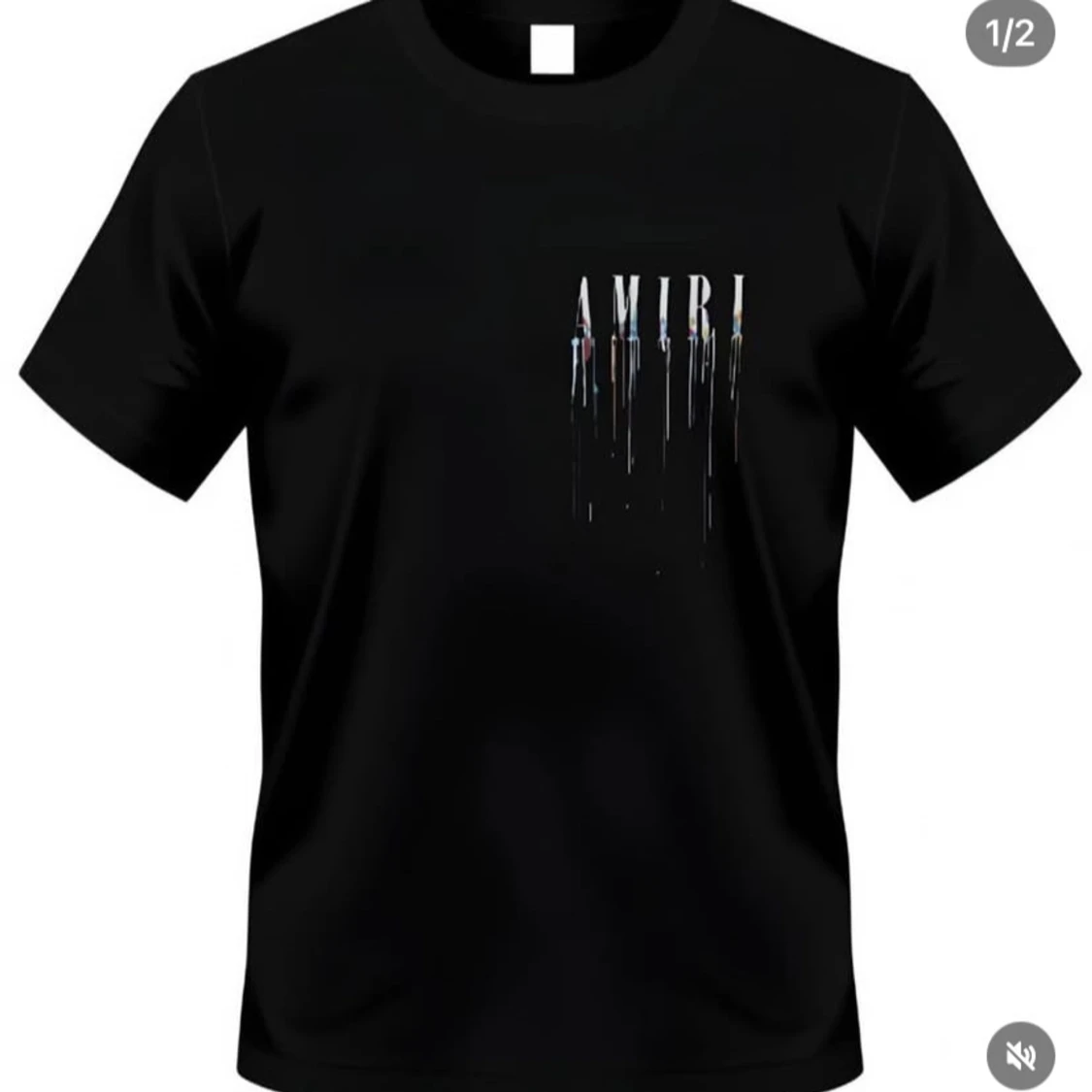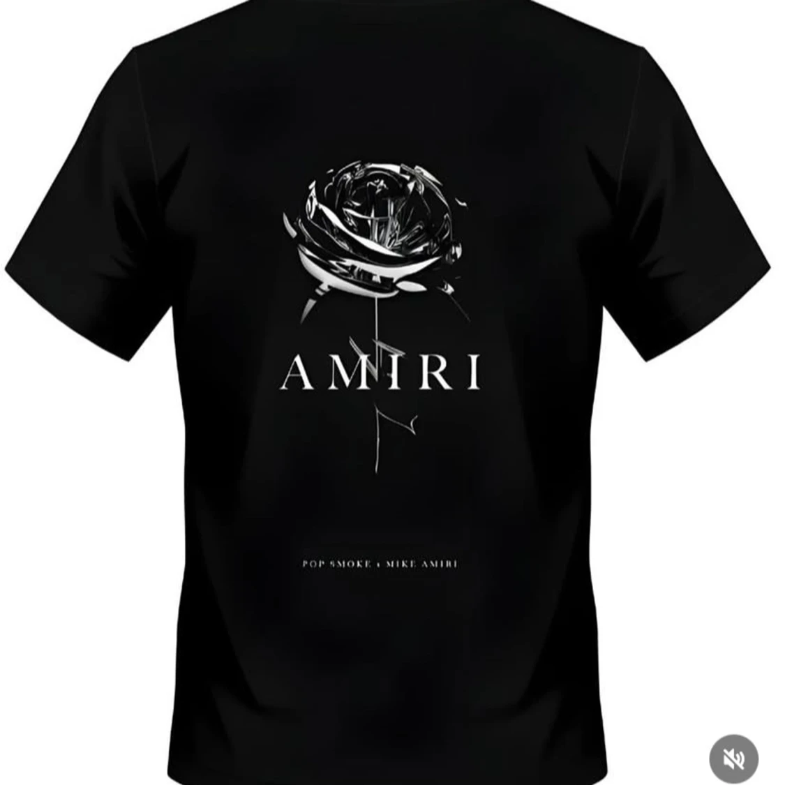 Säljer en svart t-shirt från Amiri med tryck på både fram- och baksidan. Framsidan har ett diskret Amiri-tryck med droppande effekt, medan baksidan har en stor ros och Amiri-logga. Perfekt för dig som gillar streetwear och snygga detaljer.