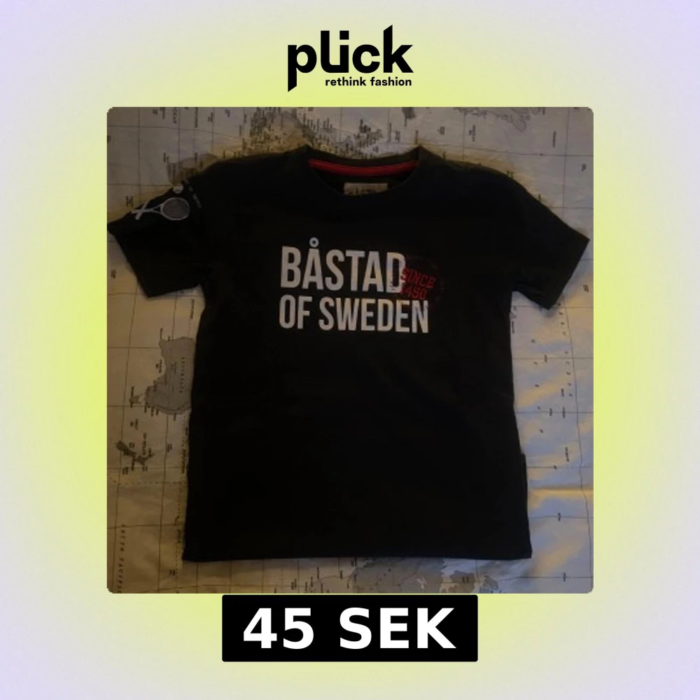 Svart t-shirt från Båstad med stort vitt tryck 'Båstad of Sweden' och röd detalj 'Since 1450' på bröstet. Klassisk rund halsringning med röd insida.