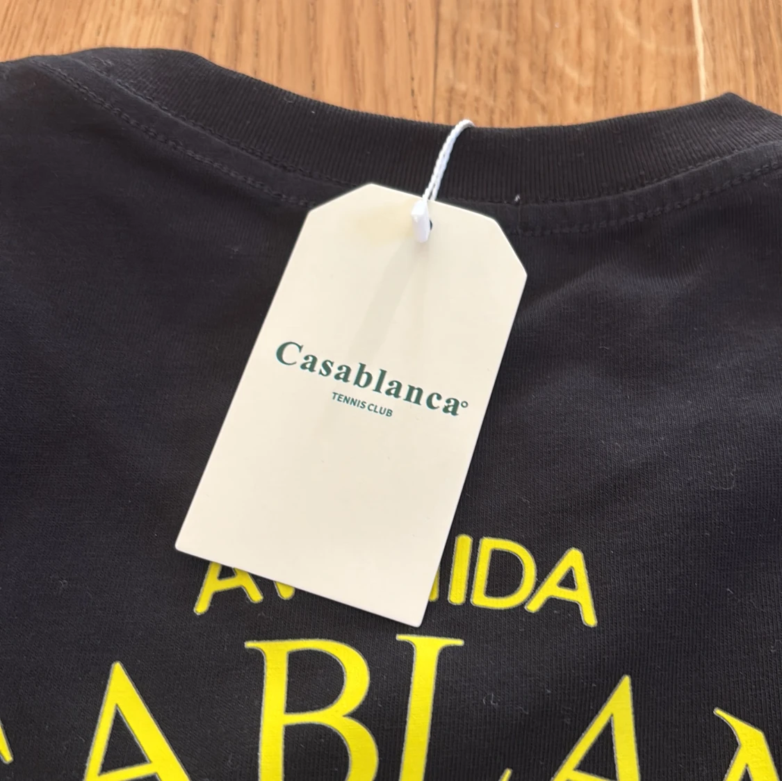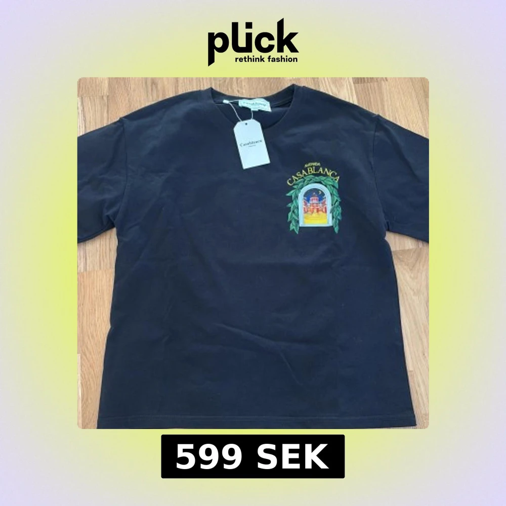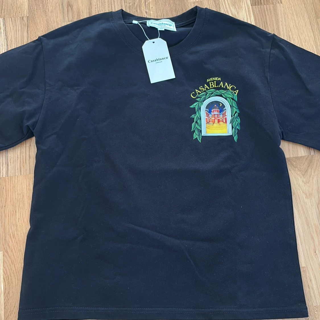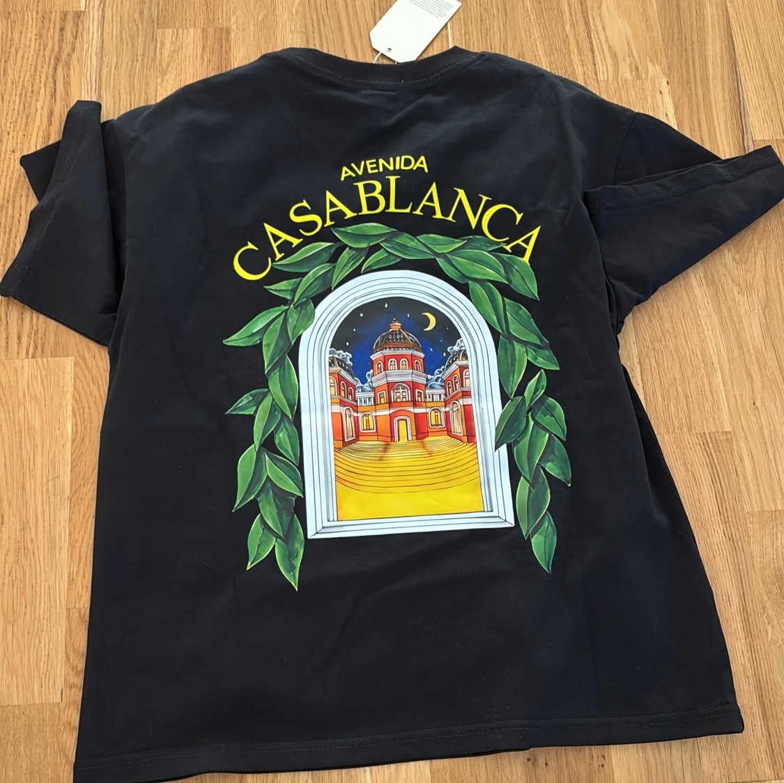 Svart t-shirt från Casablanca med färgglad tryckt grafik fram och bak, där motivet visar en byggnad och gröna blad i fönsterform. T-shirten har rund hals och korta ärmar. Materialet är mjuk bomull och passformen är normal. Storlek XS