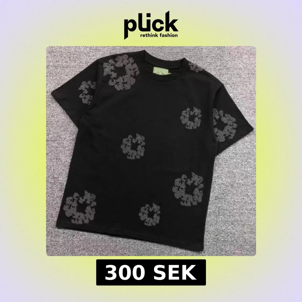 Säljer en svart t-shirt med gråblommigt mönster. T-shirten har rund hals och korta ärmar. Perfekt för dig som vill ha en stilren men ändå unik look.