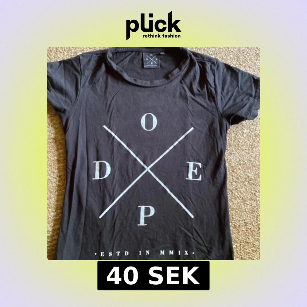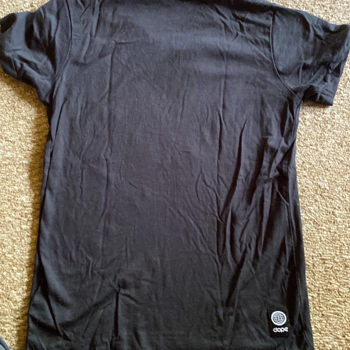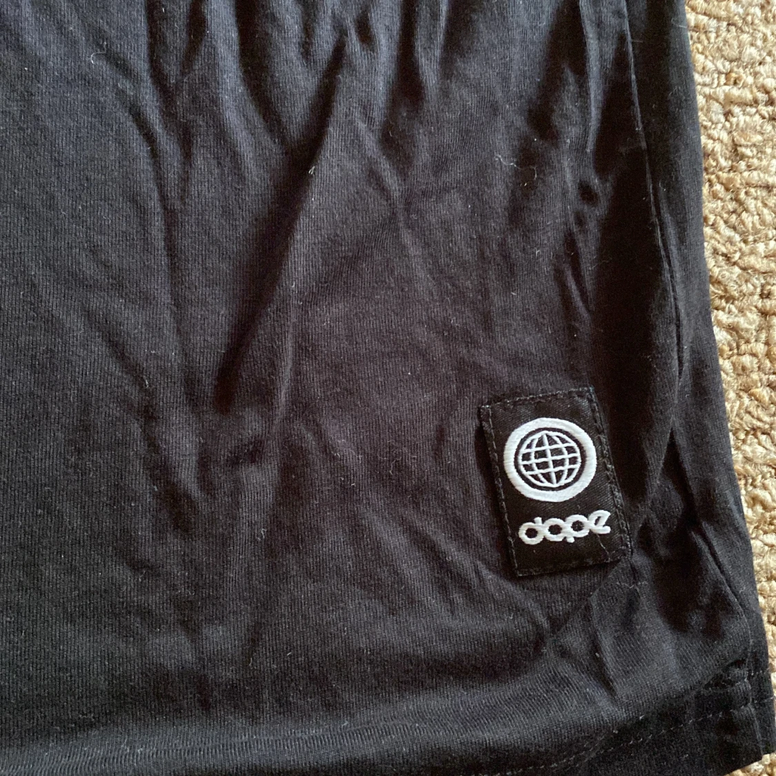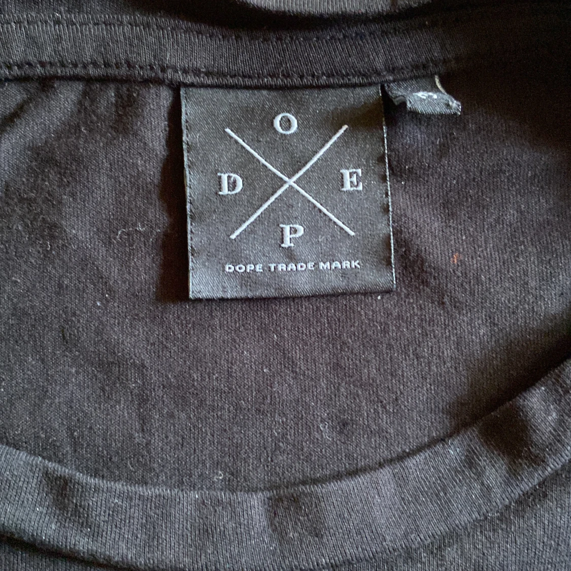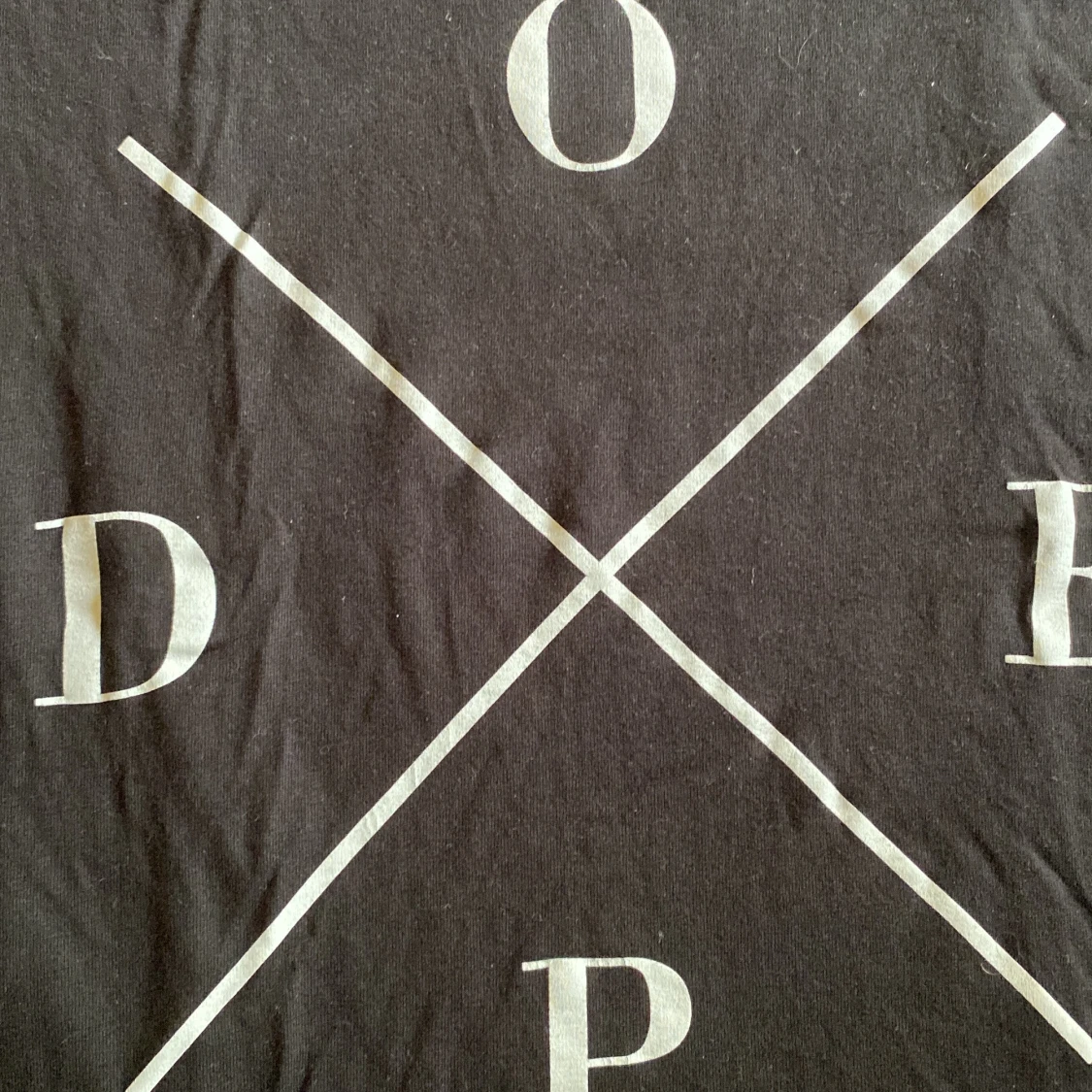 Svart t-shirt från Dope med stort vitt grafiskt tryck på framsidan där bokstäverna D, O, P, E bildar ett kors. Rund halsringning och korta ärmar. Liten logga nertill på baksidan. Skön och enkel stil. Storlek 34