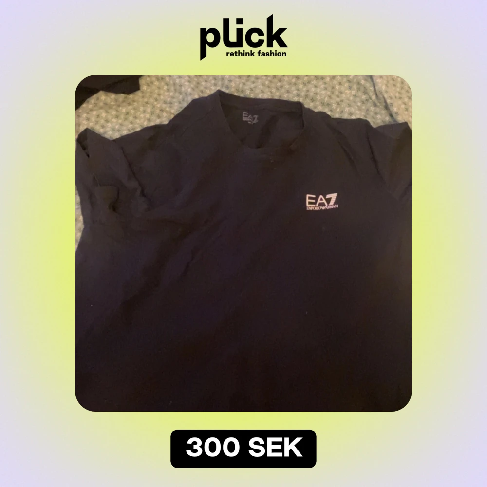 Säljer en svart t-shirt från Emporio Armani, EA7. Den är i mycket bra skick och har en enkel design med EA7-loggan på bröstet. Perfekt för vardagsbruk eller träning. Storlek L och tillverkad i ett mjukt material.
