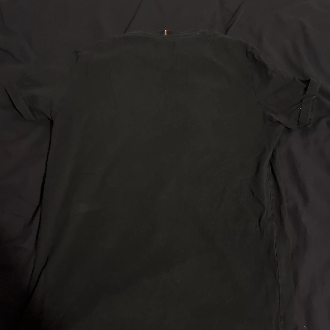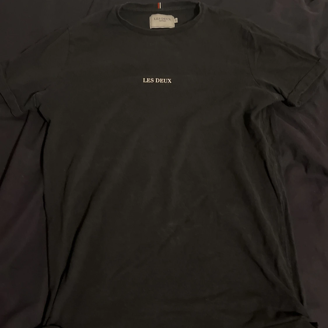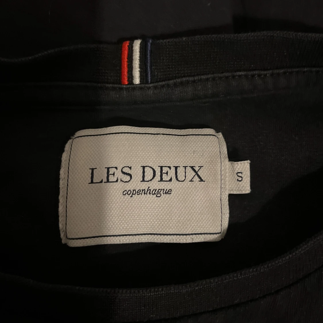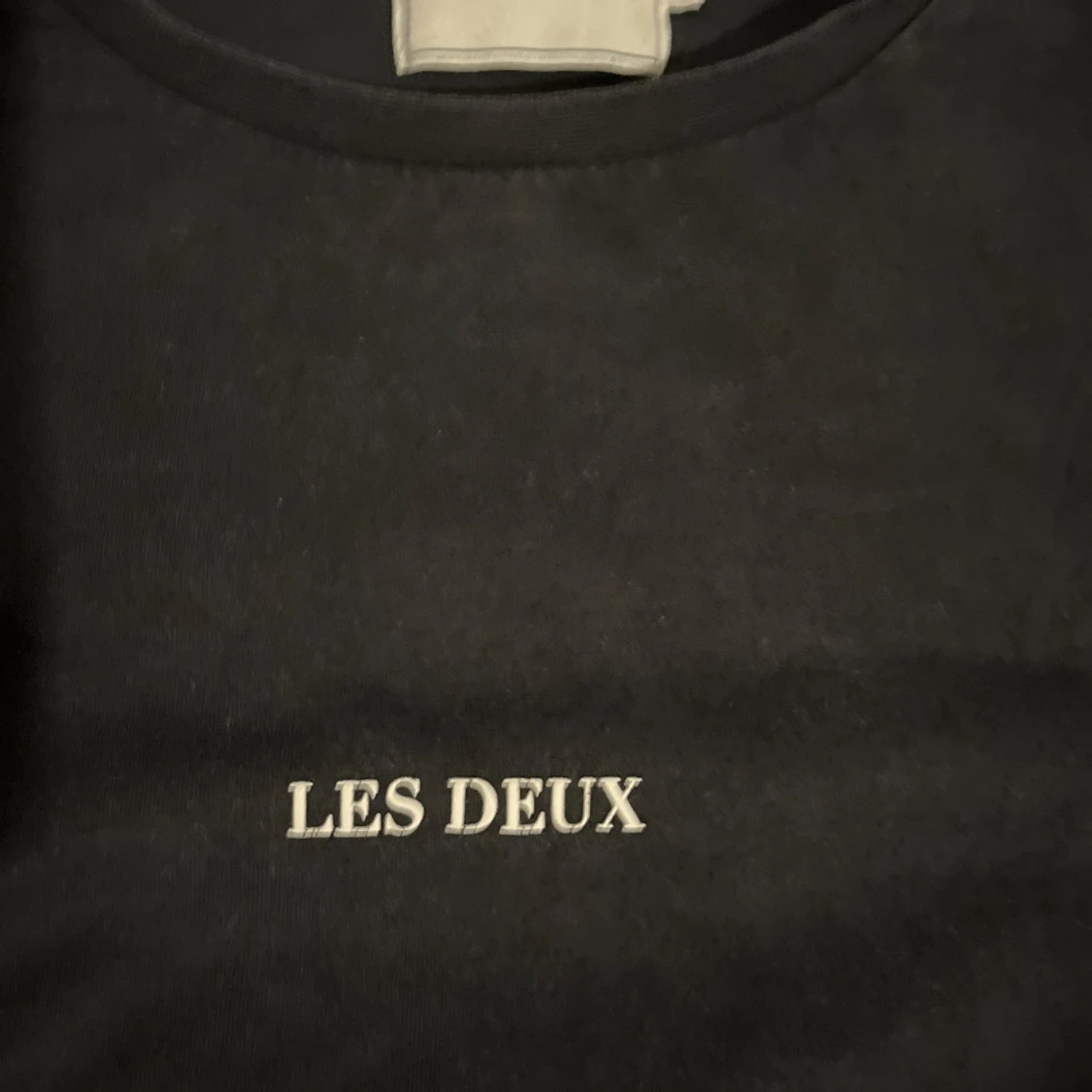 Svart t-shirt från Les Deux med vit broderad logga på bröstet. Klassisk rund hals och korta ärmar. Tillverkad i mjuk bomull som känns skön mot huden. Enkel och stilren design som funkar till allt. Snygg detalj med liten röd, vit och blå rand vid nacken. Nypris ca 500-600 kr. Fråga gärna om mått.
