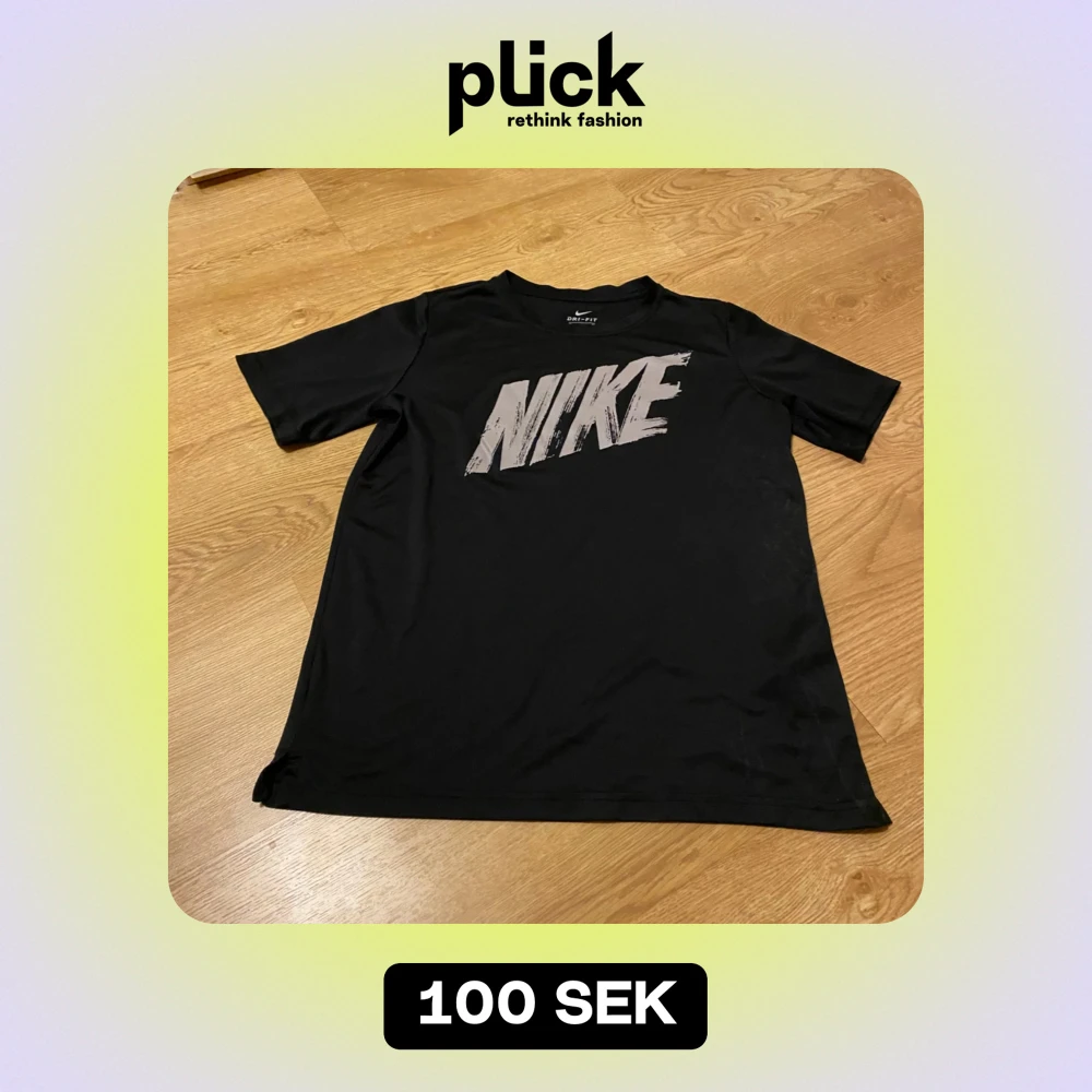 Säljer en svart Nike t-shirt i Dri-FIT material, perfekt för träning. Den har en stor vit Nike-logga på framsidan och är kortärmad. Passar ungdomar i åldern 13-15 år. Skön och andas bra, idealisk för sportiga aktiviteter.