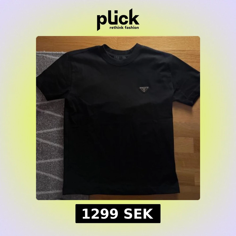 Snygg svart t-shirt i Storlek S från Prada med klassisk rund hals och korta ärmar. På bröstet sitter Pradas ikoniska trekantiga logga i metall. T-shirten är gjord i mjuk bomull och har en clean, stilren look som passar till allt. Pris kan diskuteras vid snabb affär