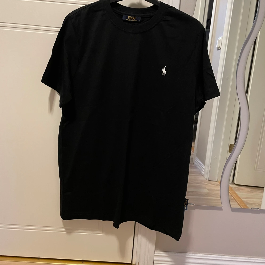 Klassisk svart t-shirt från Polo Ralph Lauren med vit broderad logga på bröstet. Enkel och stilren design med rund hals och korta ärmar. Perfekt basplagg för en clean look.
