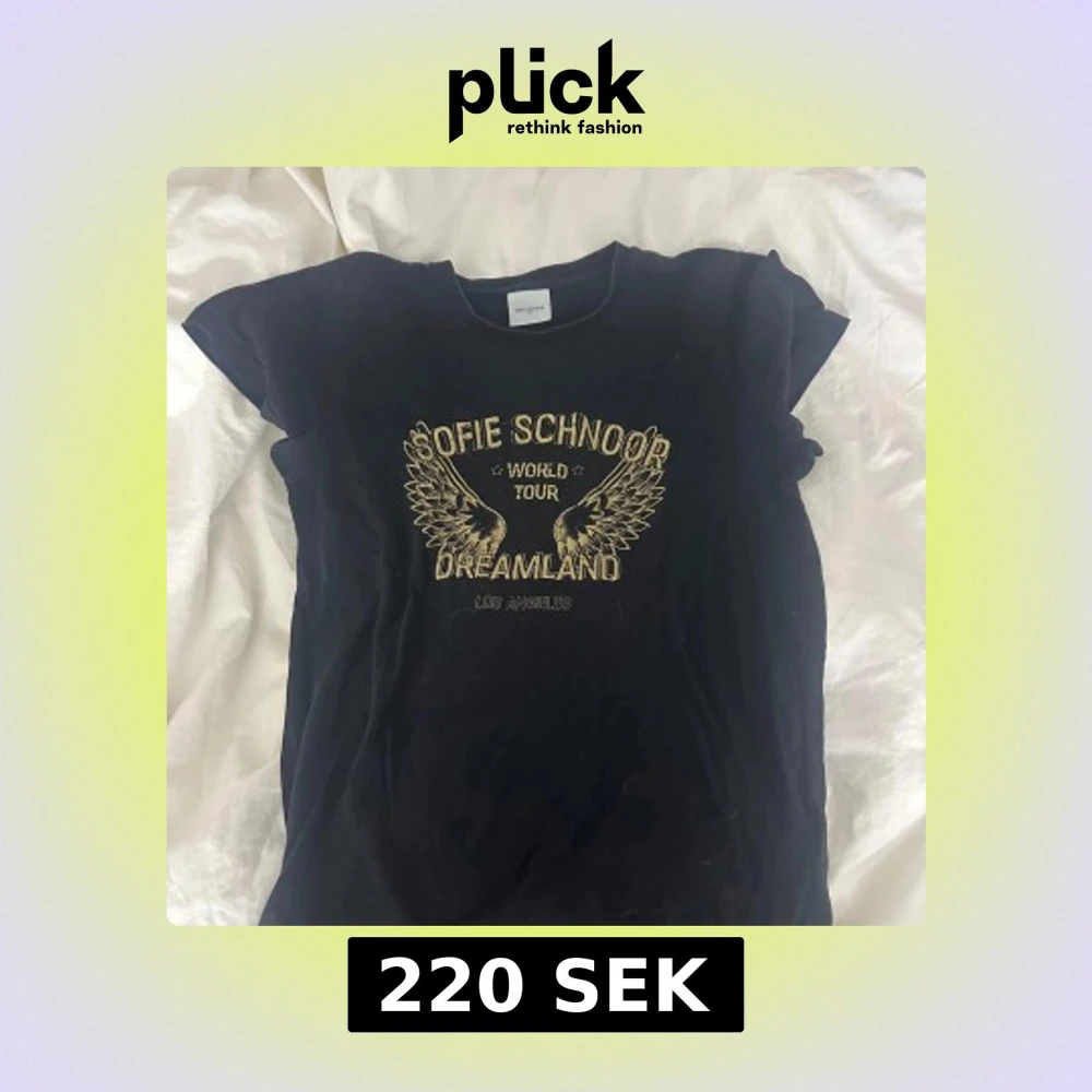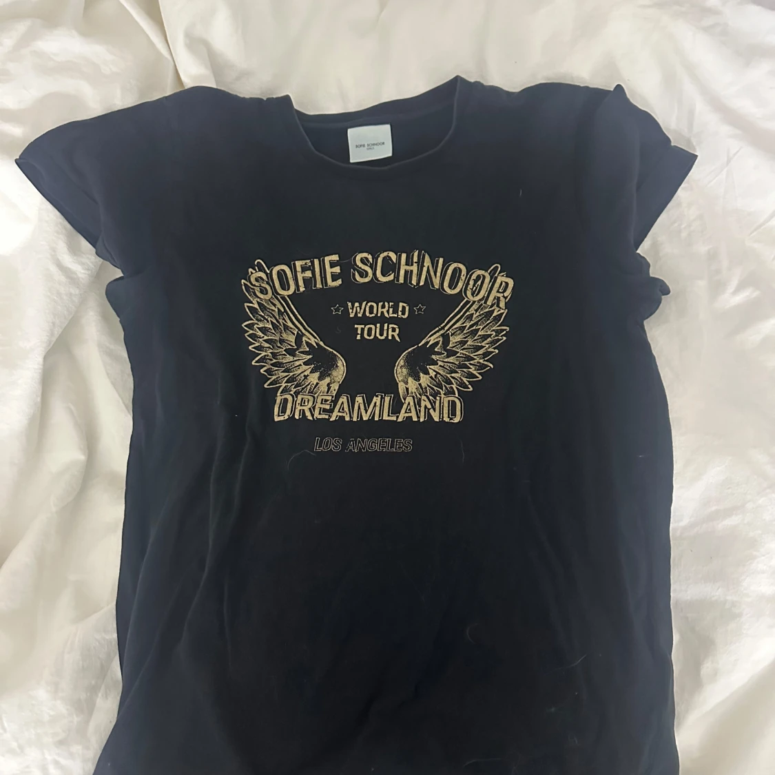 Snygg svart t-shirt från Sofie Schnoor med tryck i guld och texten 'World Tour Dreamland Los Angeles'. Perfekt för en cool och avslappnad stil.