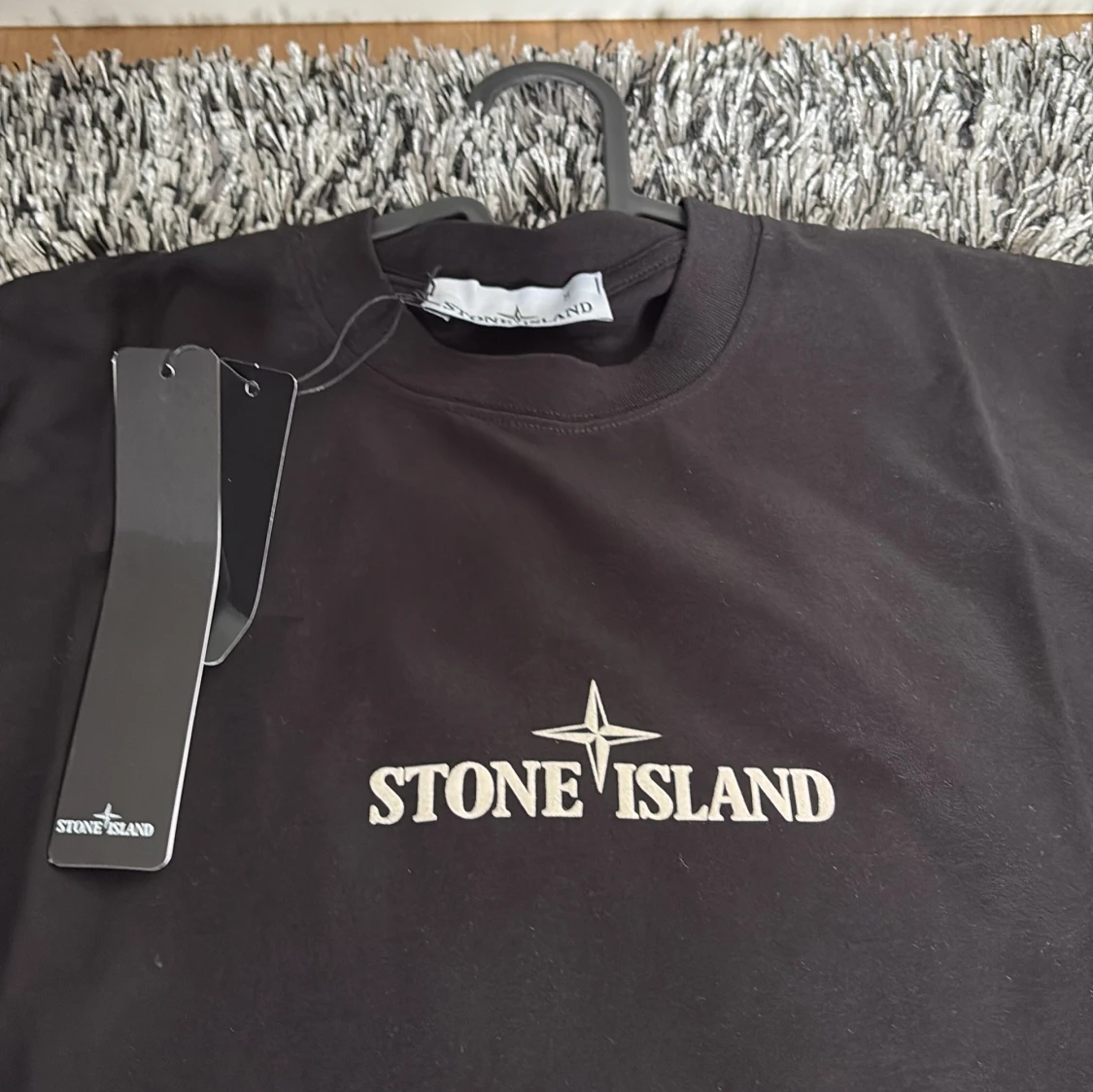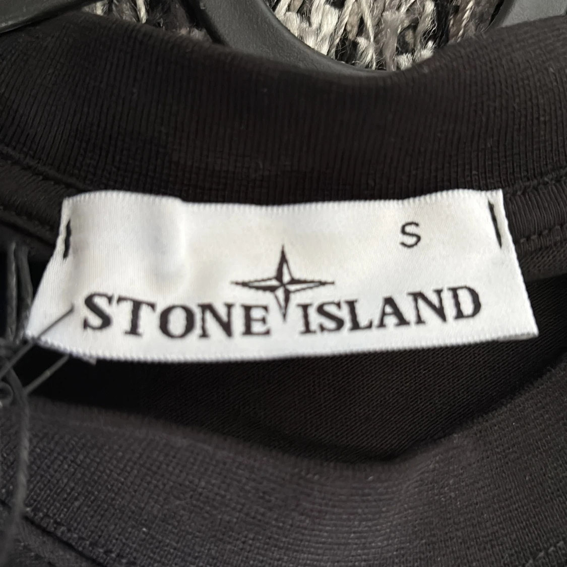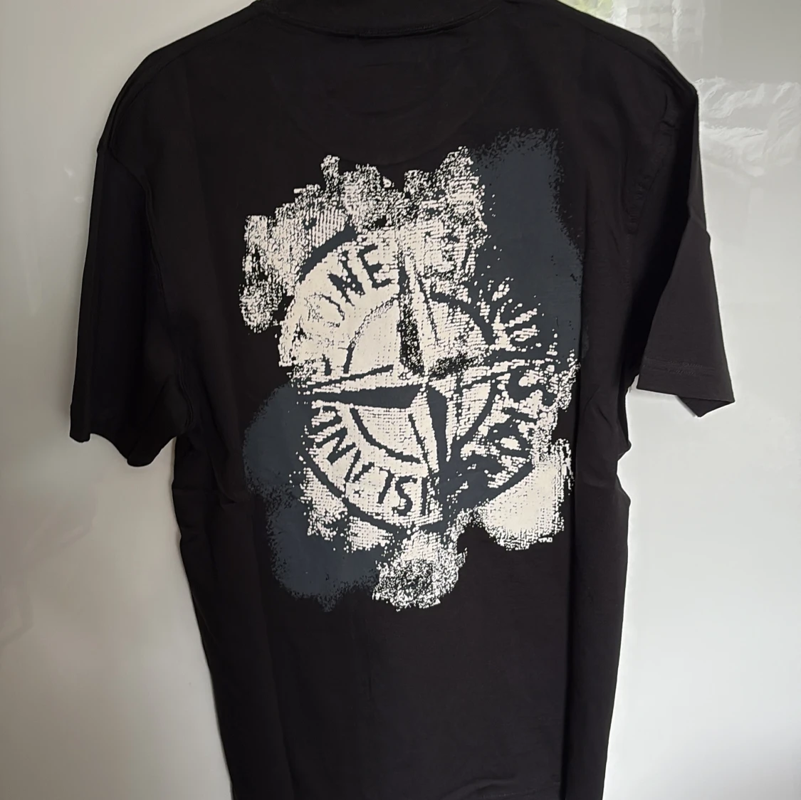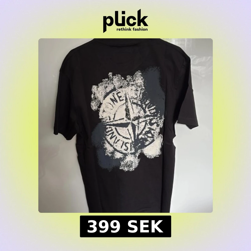 Säljer en svart t-shirt från Stone Island med stort tryck på ryggen och logga framtill. T-shirten har rund hals och korta ärmar. Storlek S - nytt skick är inte använd. (Lappar kvar) passar 170-180