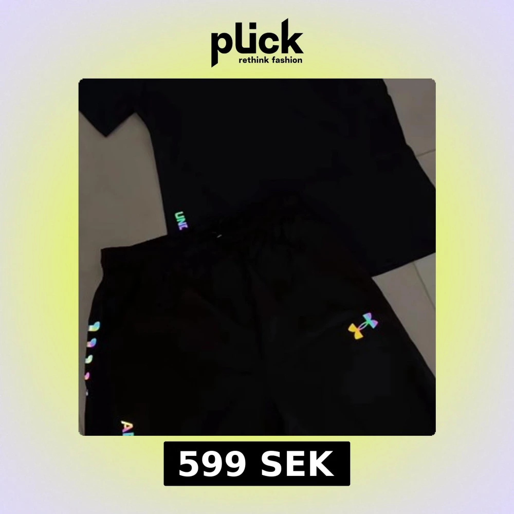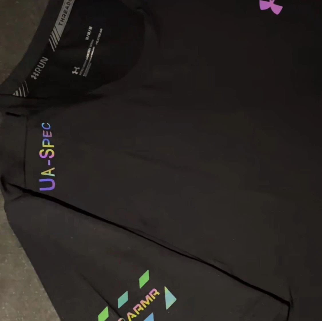 Svart t-shirt från Under Armour med coola regnbågsfärgade tryck och logga på bröstet och ärmen. T-shirten är kortärmad och har en sportig vibe, perfekt för dig som gillar att sticka ut lite extra. Materialet är mjukt och andas, vilket gör den skön att ha på sig.
