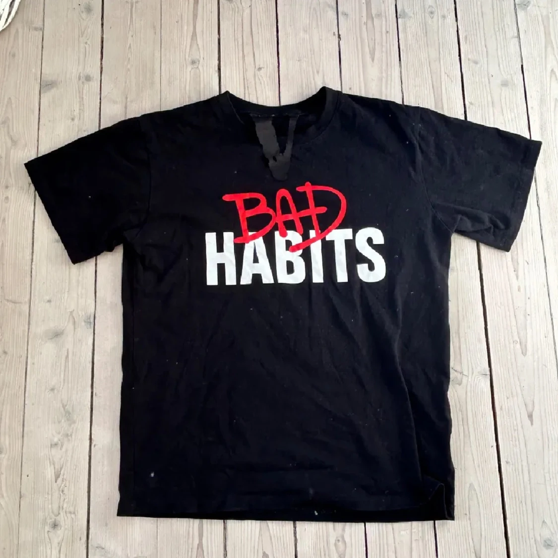 Säljer en svart t-shirt med coolt tryck. På framsidan står det 'BAD HABITS' i vitt med 'BAD' i rött. Baksidan har ett stort rött 'V'. Perfekt för en avslappnad stil!