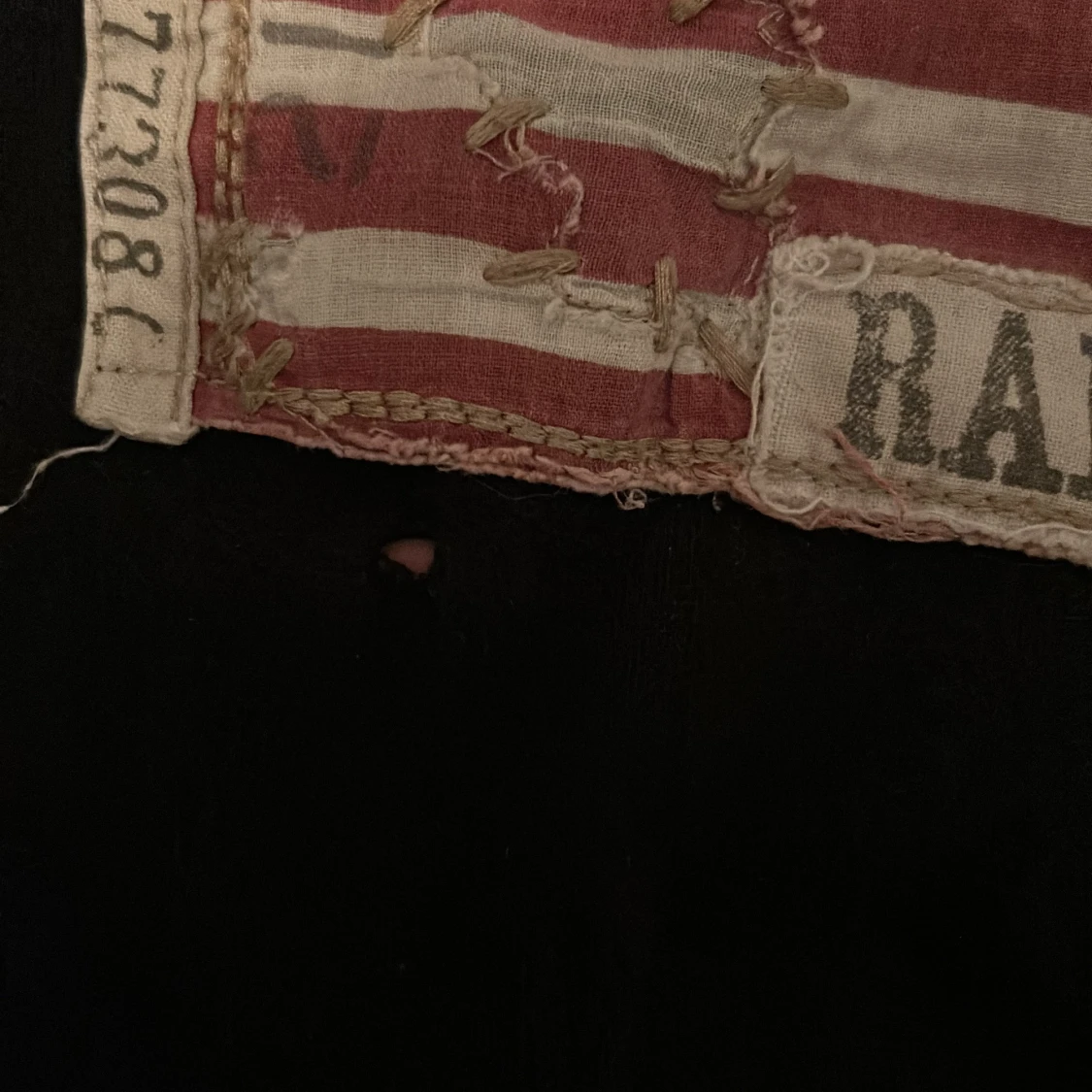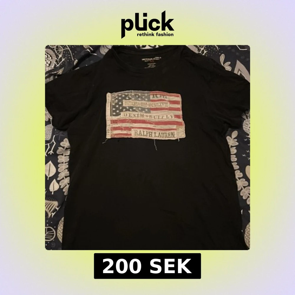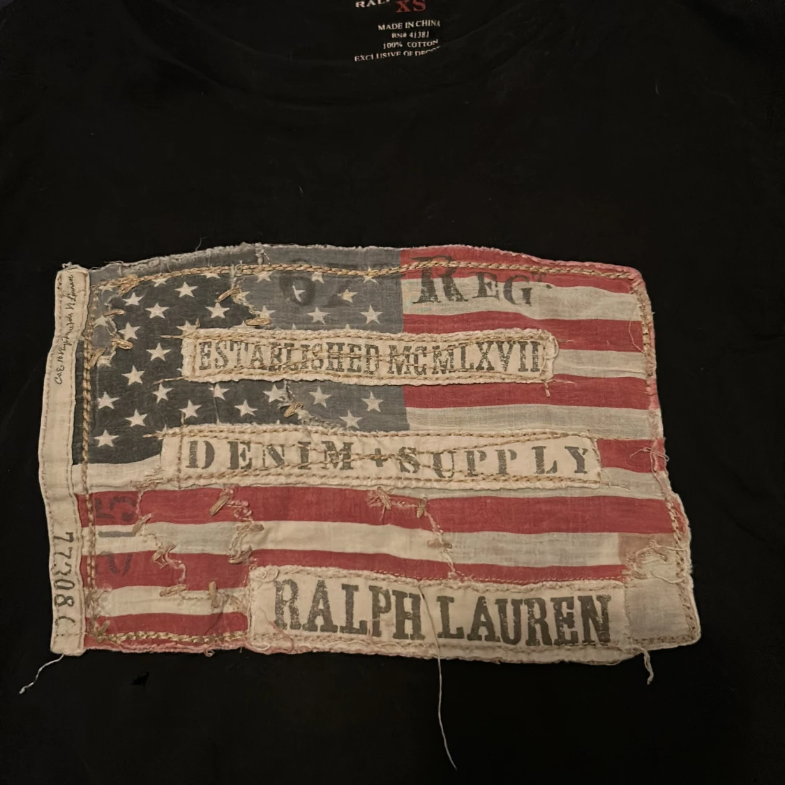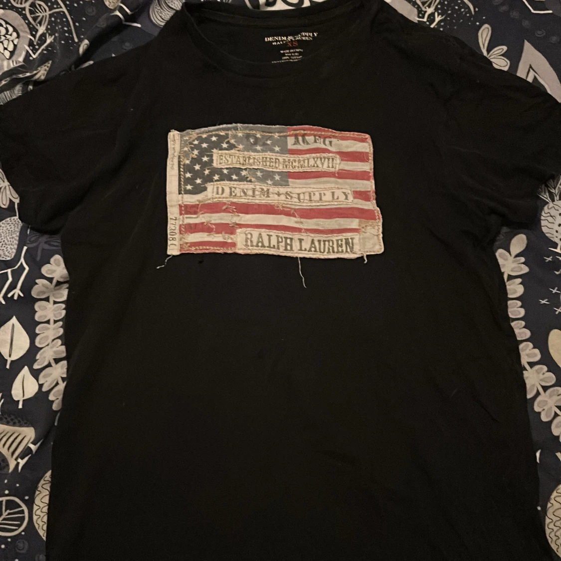Cool svart t-shirt från Ralph Lauren med en stor patch framtill som föreställer en sliten amerikansk flagga och texten 'Denim & Supply'. T-shirten har rund hals och korta ärmar. Perfekt för en avslappnad stil. Litet hål under flaggan men inget man märker av