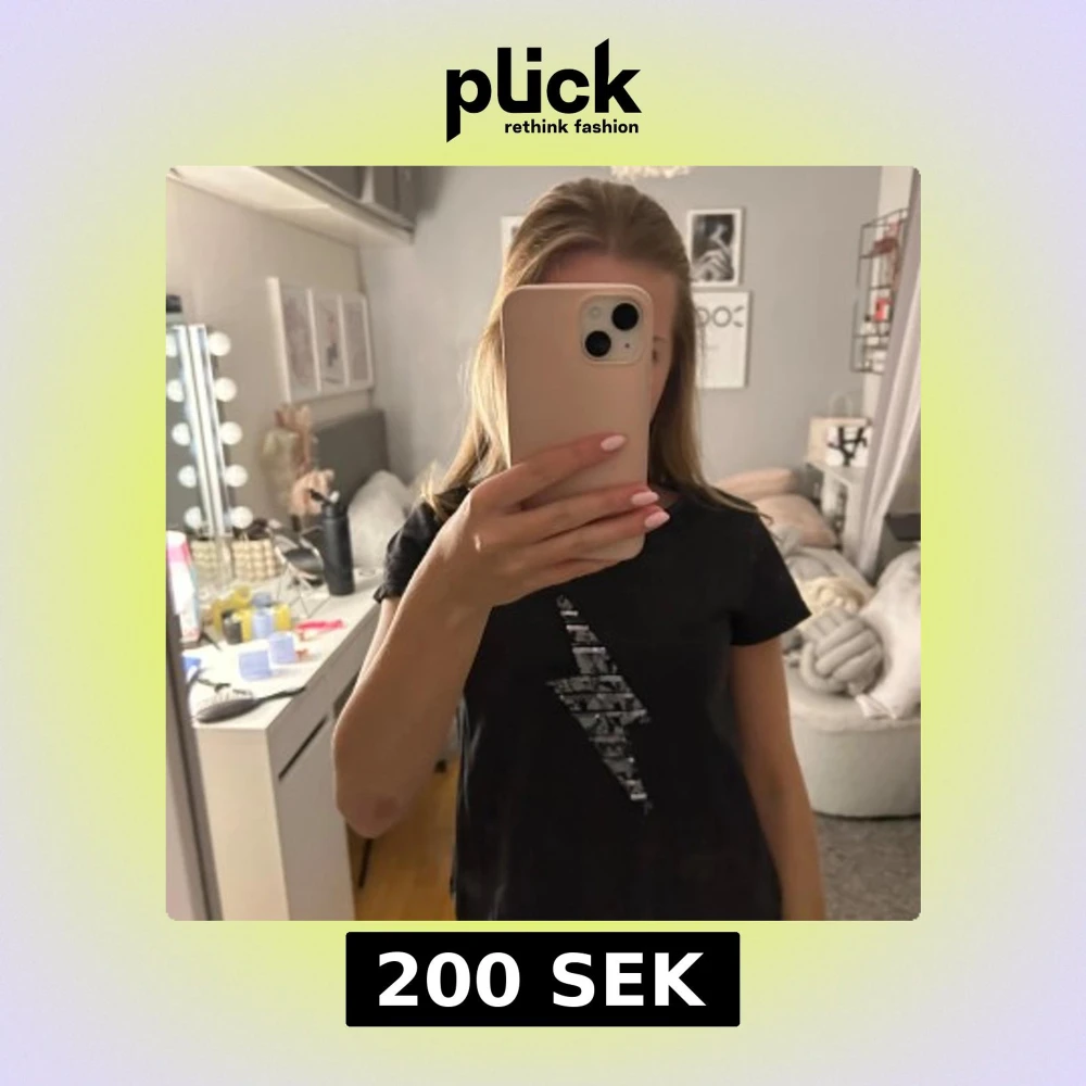 Snygg svart t-shirt med ett coolt blixtmotiv i silver på framsidan. T-shirten har korta ärmar och rund halsringning med dekorativa knappar. Perfekt för en avslappnad stil. Liknar Zadig t shirten strl 158