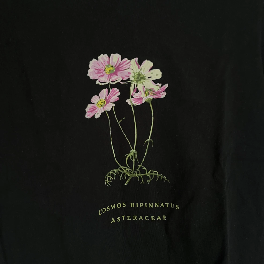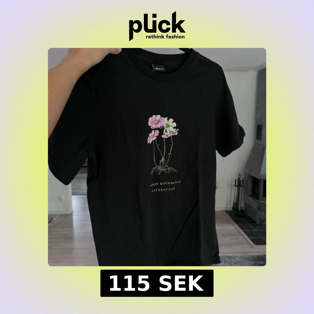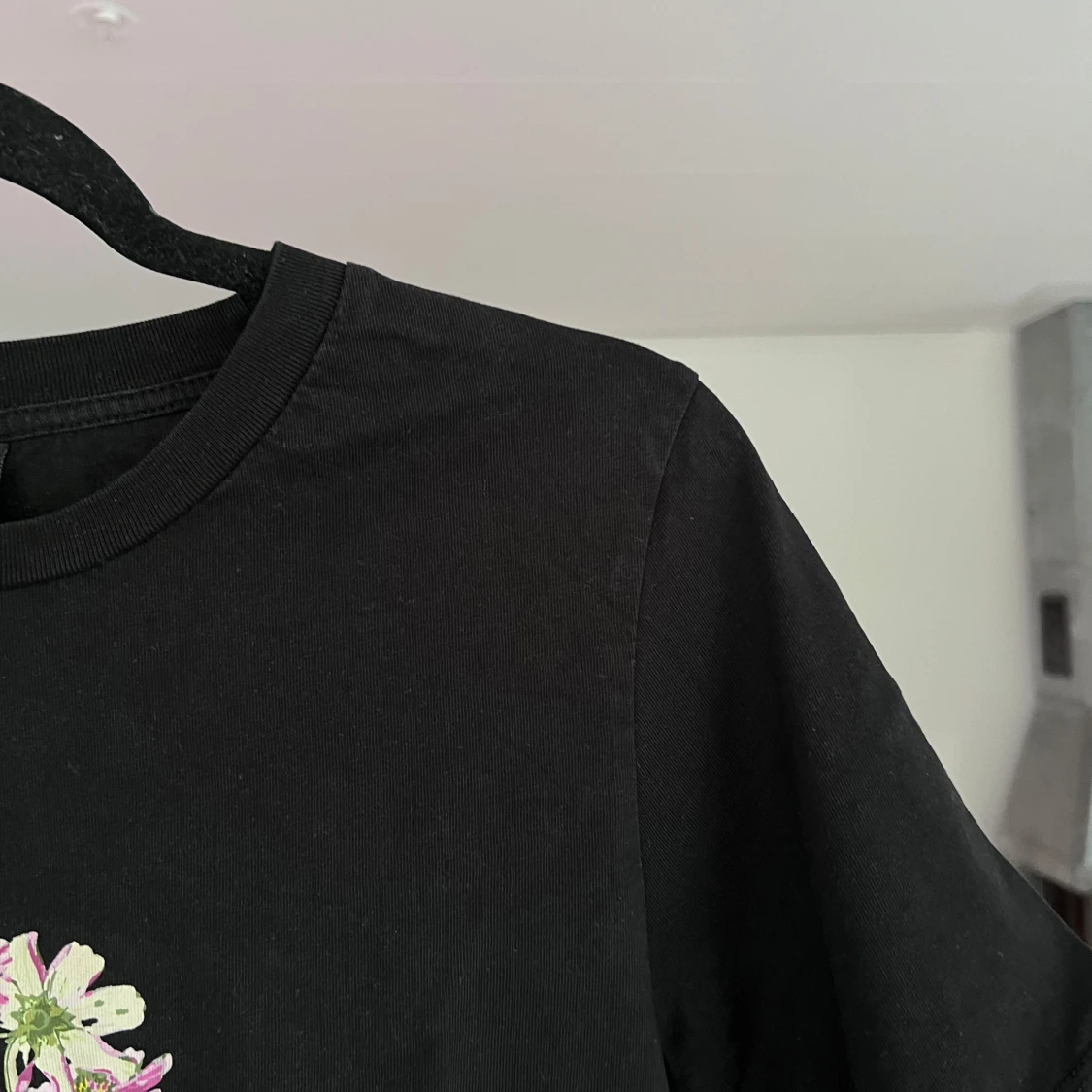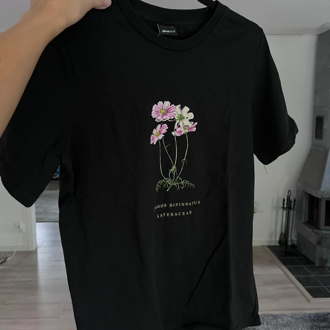 Svart t-shirt från Gina Tricot med tryck av rosa och vita blommor på bröstet. Klassisk rund halsringning och korta ärmar. Tillverkad i mjuk bomull, perfekt för en chill och stilren look. Önskar du veta exakta mått? Tveka inte att höra av dig!