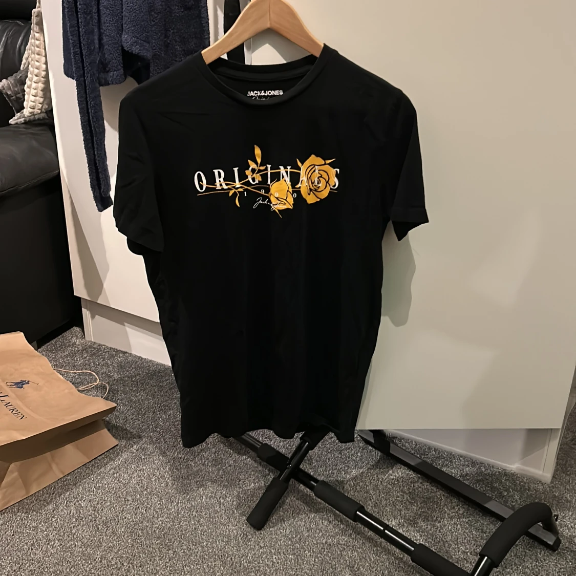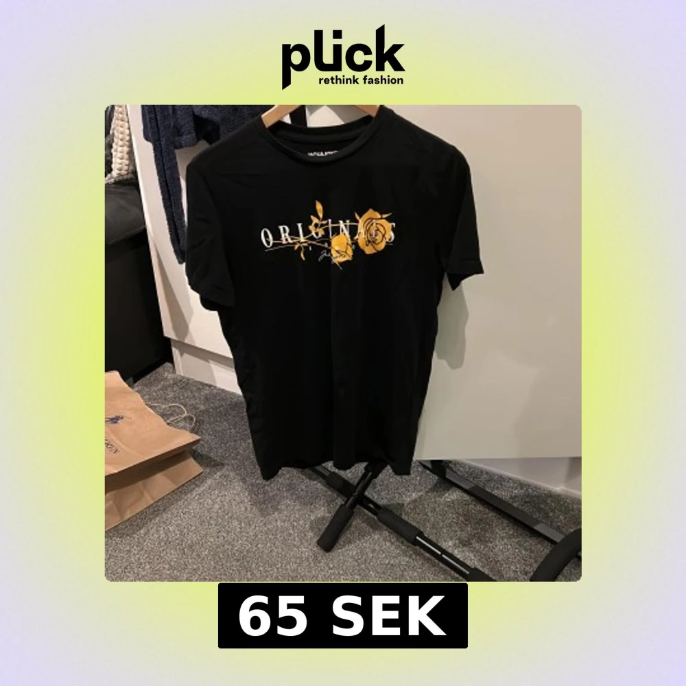 Säljer en svart t-shirt från Jack & Jones med tryck av texten 'ORIGINS' och en gul ros på bröstet. T-shirten har rund halsringning och korta ärmar. Perfekt för en stilren och trendig look.